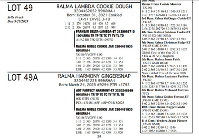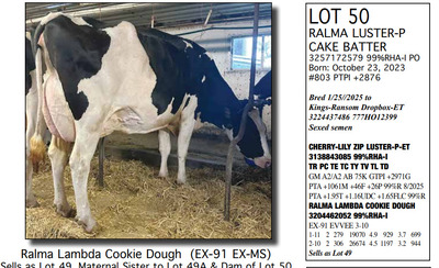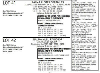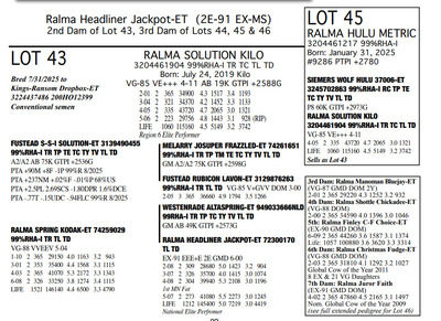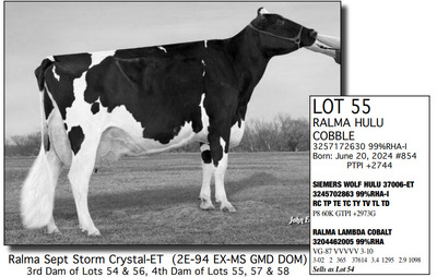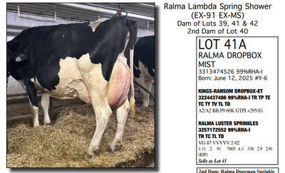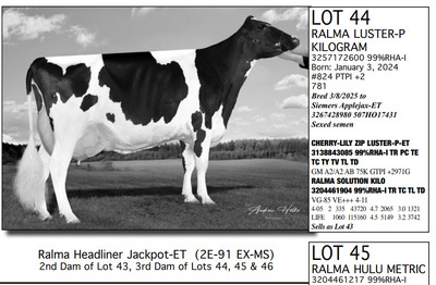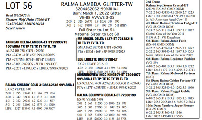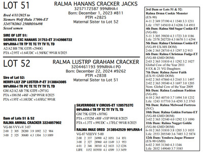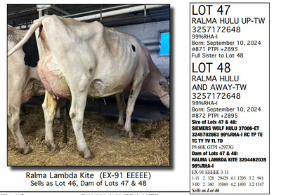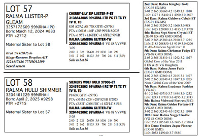 FAMILIES BUILT ON FAITH 16699 25th Ave NW , Rice MN, 56367 Great offering of genetics... Contact Agent: Aaron Ray Tompkins 336-363-4639 Catalog | Terms of Auction Download CATALOG Download SALE ORDER Download UPDATES Download ADDED LOT 175 Catalog | Terms Download CATALOG Download SALE ORDER Download UPDATES Download ADDED LOT 175 All Items (184) Cattle (184) Categories All Items (184) Cattle (184) Search Item #: Keyword: Search Catalog Item #: Keyword: 20 items per page 50 items per page 100 items per page Go to page #: 1 , 2 , 3 , 4 , 5 , 6 #41 – RALMA LUSTER SPRINKLES 3257172552 99%RHA-I TR TC TL TD A2/A2 AB P8 32K Born: June 17, 2023 Flower VG-87 VVVVV 2-02 GTPI +2751G Maternal Sister to Lot 42 Bred 9/13/2025 to Kings-Ransom Dropbox-ET 3224437486 777HO12399 Location: 16699 25th Ave NW , Rice MN, 56367 Contact Agent: Aaron Ray Tompkins 336-363-4639 More Info / Bid Now Track this Item Sold High Bid: $7,100.00 – #1038 #41 – RALMA LUSTER SPRINKLES Sold High Bid: $7,100 More Details More Info / Bid Track Item 3257172552 99%RHA-I TR TC TL TD A2/A2 AB P8 32K Born: June 17, 2023 Flower VG-87 VVVVV 2-02 GTPI +2751G Maternal Sister to Lot 42 Bred 9/13/2025 to Kings-Ransom Dropbox-ET 3224437486 777HO12399 Location: 16699 25th Ave NW , Rice MN, 56367 Contact Agent: Aaron Ray Tompkins 336-363-4639 #41A – RALMA DROPBOX MIST 3313474526 99%RHA-I Born: June 12, 2025 #Y-6 Location: 16699 25th Ave NW , Rice MN, 56367 Contact Agent: Aaron Ray Tompkins 336-363-4639 More Info / Bid Now Track this Item Sold High Bid: $3,600.00 – #5 #41A – RALMA DROPBOX MIST Sold High Bid: $3,600 More Details More Info / Bid Track Item 3313474526 99%RHA-I Born: June 12, 2025 #Y-6 Location: 16699 25th Ave NW , Rice MN, 56367 Contact Agent: Aaron Ray Tompkins 336-363-4639 #42 – RALMA HULU RAINDROP 3257172627 99%RHA-I Born: June 7, 2024 #851 PTPI +2816 Maternal Sister to Lot 41 Bred 8/29/2025 to Kings-Ransom Dropbox-ET 3224437486 777HO12399 Sexed semen Location: 16699 25th Ave NW , Rice MN, 56367 Contact Agent: Aaron Ray Tompkins 336-363-4639 More Info / Bid Now Track this Item Sold High Bid: $4,100.00 – #30 #42 – RALMA HULU RAINDROP Sold High Bid: $4,100 More Details More Info / Bid Track Item 3257172627 99%RHA-I Born: June 7, 2024 #851 PTPI +2816 Maternal Sister to Lot 41 Bred 8/29/2025 to Kings-Ransom Dropbox-ET 3224437486 777HO12399 Sexed semen Location: 16699 25th Ave NW , Rice MN, 56367 Contact Agent: Aaron Ray Tompkins 336-363-4639 #43 – RALMA SOLUTION KILO 3204461904 99%RHA-I TR TC TL TD Born: July 24, 2019 Kilo VG-85 VE+++ 4-11 AB 19K GTPI +2588G 2-01 2 365 34900 4.3 1517 3.4 1193 3-04 2 321 34370 4.2 1452 3.3 1133 4-05 2 335 43720 4.7 2065 3.0 1321 5-06 2 223 29756 4.8 1443 3.1 928 (RIP) LIFE 1060 115160 4.5 5149 3.2 3742 Region 6 Elite Performer Bred 7/31/2025 to Kings-Ransom Dropbox-ET 3224437486 200HO12399 Conventional semen Location: 16699 25th Ave NW , Rice MN, 56367 Contact Agent: Aaron Ray Tompkins 336-363-4639 More Info / Bid Now Track this Item Sold High Bid: $3,750.00 – #3 #43 – RALMA SOLUTION KILO Sold High Bid: $3,750 More Details More Info / Bid Track Item 3204461904 99%RHA-I TR TC TL TD Born: July 24, 2019 Kilo VG-85 VE+++ 4-11 AB 19K GTPI +2588G 2-01 2 365 34900 4.3 1517 3.4 1193 3-04 2 321 34370 4.2 1452 3.3 1133 4-05 2 335 43720 4.7 2065 3.0 1321 5-06 2 223 29756 4.8 1443 3.1 928 (RIP) LIFE 1060 115160 4.5 5149 3.2 3742 Region 6 Elite Performer Bred 7/31/2025 to Kings-Ransom Dropbox-ET 3224437486 200HO12399 Conventional semen Location: 16699 25th Ave NW , Rice MN, 56367 Contact Agent: Aaron Ray Tompkins 336-363-4639 #44 – RALMA LUSTER-P KILOGRAM 3257172600 99%RHA-I Born: January 3, 2024 #824 PTPI +2 781 Bred 3/8/2025 to Siemers Applejax-ET 3267428980 507HO17431 Sexed semen Location: 16699 25th Ave NW , Rice MN, 56367 Contact Agent: Aaron Ray Tompkins 336-363-4639 More Info / Bid Now Track this Item Sold High Bid: $4,700.00 – #47 #44 – RALMA LUSTER-P KILOGRAM Sold High Bid: $4,700 More Details More Info / Bid Track Item 3257172600 99%RHA-I Born: January 3, 2024 #824 PTPI +2 781 Bred 3/8/2025 to Siemers Applejax-ET 3267428980 507HO17431 Sexed semen Location: 16699 25th Ave NW , Rice MN, 56367 Contact Agent: Aaron Ray Tompkins 336-363-4639 #45 – RALMA HULU METRIC 3204461217 99%RHA-I Born: January 31, 2025 #9286 PTPI +2780 Location: 16699 25th Ave NW , Rice MN, 56367 Contact Agent: Aaron Ray Tompkins 336-363-4639 More Info / Bid Now Track this Item Sold High Bid: $3,200.00 – #47 #45 – RALMA HULU METRIC Sold High Bid: $3,200 More Details More Info / Bid Track Item 3204461217 99%RHA-I Born: January 31, 2025 #9286 PTPI +2780 Location: 16699 25th Ave NW , Rice MN, 56367 Contact Agent: Aaron Ray Tompkins 336-363-4639 #46 – RALMA LAMBDA KITE 3204462035 99%RHA-I TR TP TC TL TD Born: September 3, 2021 Kite EX-91 EEEEE 3-11 A1/A2 32K GTPI +2818G 1-11 2 328 29429 4.1 1205 3.2 941 3-00 2 360 35869 4.2 1493 3.2 1147 Bred 1/19/2025 to Kings-Ransom Dropbox-ET 3224437486 777HO12399 Sexed semen Location: 16699 25th Ave NW , Rice MN, 56367 Contact Agent: Aaron Ray Tompkins 336-363-4639 More Info / Bid Now Track this Item Sold High Bid: $8,000.00 – #8 #46 – RALMA LAMBDA KITE Sold High Bid: $8,000 More Details More Info / Bid Track Item 3204462035 99%RHA-I TR TP TC TL TD Born: September 3, 2021 Kite EX-91 EEEEE 3-11 A1/A2 32K GTPI +2818G 1-11 2 328 29429 4.1 1205 3.2 941 3-00 2 360 35869 4.2 1493 3.2 1147 Bred 1/19/2025 to Kings-Ransom Dropbox-ET 3224437486 777HO12399 Sexed semen Location: 16699 25th Ave NW , Rice MN, 56367 Contact Agent: Aaron Ray Tompkins 336-363-4639 #47 – RALMA HULU UP-TW 3257172648 99%RHA-I Born: September 10, 2024 #871 PTPI +2895 Full Sister to Lot 48 Location: 16699 25th Ave NW , Rice MN, 56367 Contact Agent: Aaron Ray Tompkins 336-363-4639 More Info / Bid Now Track this Item Sold High Bid: $3,000.00 – #12 #47 – RALMA HULU UP-TW Sold High Bid: $3,000 More Details More Info / Bid Track Item 3257172648 99%RHA-I Born: September 10, 2024 #871 PTPI +2895 Fu