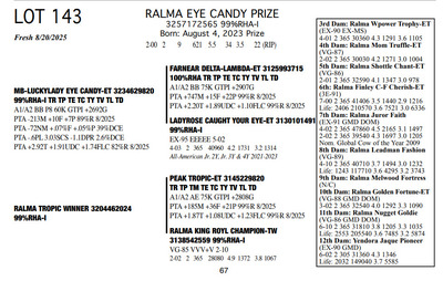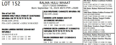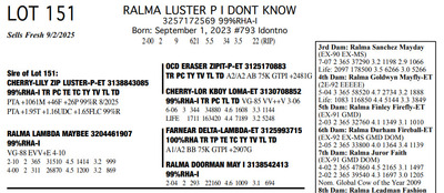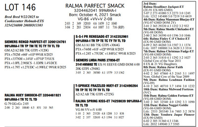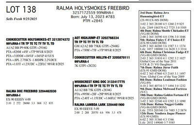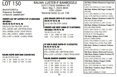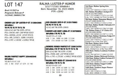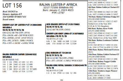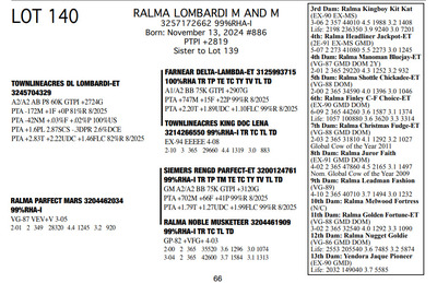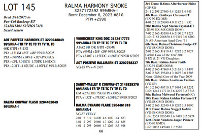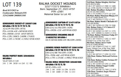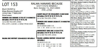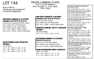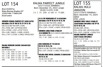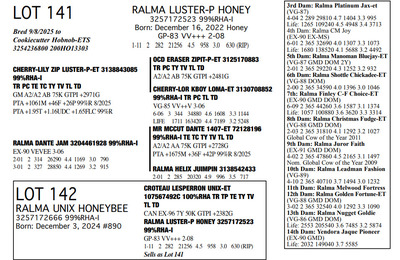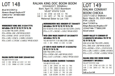 FAMILIES BUILT ON FAITH 16699 25th Ave NW , Rice MN, 56367 Great offering of genetics... Contact Agent: Aaron Ray Tompkins 336-363-4639 Catalog | Terms of Auction Download CATALOG Download SALE ORDER Download UPDATES Download ADDED LOT 175 Catalog | Terms Download CATALOG Download SALE ORDER Download UPDATES Download ADDED LOT 175 All Items (184) Cattle (184) Categories All Items (184) Cattle (184) Search Item #: Keyword: Search Catalog Item #: Keyword: 20 items per page 50 items per page 100 items per page Go to page #: 5 , 6 , 7 , 8 , 9 , 10 #138 – RALMA HOLYSMOKES FREEBIRD 3257172559 99%RHA-I Born: July 13, 2023 #783 PTPI +2845 Sells Fresh 9/25/2025 Location: 16699 25th Ave NW , Rice MN, 56367 Contact Agent: Aaron Ray Tompkins 336-363-4639 More Info / Bid Now Track this Item No Bids Starting at $1,500.00 Login to Bid #138 – RALMA HOLYSMOKES FREEBIRD Starting at $1,500.00 Login to Bid More Details More Info / Bid Track Item 3257172559 99%RHA-I Born: July 13, 2023 #783 PTPI +2845 Sells Fresh 9/25/2025 Location: 16699 25th Ave NW , Rice MN, 56367 Contact Agent: Aaron Ray Tompkins 336-363-4639 #139 – RALMA DOCKET MOUNDS 3257172573 99%RHA-I Born: September 27, 2023 #797 PTPI +2991 Maternal Sister to Lot 40 Bred 8/15/2025 to Cookiecutter Hobnob-ETS 3254236800 200HO13303 Location: 16699 25th Ave NW , Rice MN, 56367 Contact Agent: Aaron Ray Tompkins 336-363-4639 More Info / Bid Now Track this Item Sold High Bid: $3,500.00 – #11 #139 – RALMA DOCKET MOUNDS Sold High Bid: $3,500 More Details More Info / Bid Track Item 3257172573 99%RHA-I Born: September 27, 2023 #797 PTPI +2991 Maternal Sister to Lot 40 Bred 8/15/2025 to Cookiecutter Hobnob-ETS 3254236800 200HO13303 Location: 16699 25th Ave NW , Rice MN, 56367 Contact Agent: Aaron Ray Tompkins 336-363-4639 #140 – RALMA LOMBARDI M AND M 3257172662 99%RHA-I Born: November 13, 2024 #886 PTPI +2819 Sister to Lot 139 Location: 16699 25th Ave NW , Rice MN, 56367 Contact Agent: Aaron Ray Tompkins 336-363-4639 More Info / Bid Now Track this Item Sold High Bid: $2,800.00 – #19 #140 – RALMA LOMBARDI M AND M Sold High Bid: $2,800 More Details More Info / Bid Track Item 3257172662 99%RHA-I Born: November 13, 2024 #886 PTPI +2819 Sister to Lot 139 Location: 16699 25th Ave NW , Rice MN, 56367 Contact Agent: Aaron Ray Tompkins 336-363-4639 #141 – RALMA LUSTER-P HONEY 3257172523 99%RHA-I Born: December 16, 2022 Honey GP-83 VV+++ 2-08 1-11 2 282 21256 4.5 958 3.0 630 (RIP) Bred 9/8/2025 to Cookiecutter Hobnob-ETS 3254236800 200HO13303 Location: 16699 25th Ave NW , Rice MN, 56367 Contact Agent: Aaron Ray Tompkins 336-363-4639 More Info / Bid Now Track this Item Sold High Bid: $3,400.00 – #38 #141 – RALMA LUSTER-P HONEY Sold High Bid: $3,400 More Details More Info / Bid Track Item 3257172523 99%RHA-I Born: December 16, 2022 Honey GP-83 VV+++ 2-08 1-11 2 282 21256 4.5 958 3.0 630 (RIP) Bred 9/8/2025 to Cookiecutter Hobnob-ETS 3254236800 200HO13303 Location: 16699 25th Ave NW , Rice MN, 56367 Contact Agent: Aaron Ray Tompkins 336-363-4639 #142 – RALMA UNIX HONEYBEE 3257172666 99%RHA-I Born: December 3, 2024 #890 Location: 16699 25th Ave NW , Rice MN, 56367 Contact Agent: Aaron Ray Tompkins 336-363-4639 More Info / Bid Now Track this Item Sold High Bid: $2,800.00 – #19 #142 – RALMA UNIX HONEYBEE Sold High Bid: $2,800 More Details More Info / Bid Track Item 3257172666 99%RHA-I Born: December 3, 2024 #890 Location: 16699 25th Ave NW , Rice MN, 56367 Contact Agent: Aaron Ray Tompkins 336-363-4639 #143 – RALMA EYE CANDY PRIZE 3257172565 99%RHA-I Born: August 4, 2023 Prize 2-00 2 9 621 5.5 34 3.5 22 (RIP) Fresh 8/20/2025 Location: 16699 25th Ave NW , Rice MN, 56367 Contact Agent: Aaron Ray Tompkins 336-363-4639 More Info / Bid Now Track this Item Sold High Bid: $4,500.00 – #10 #143 – RALMA EYE CANDY PRIZE Sold High Bid: $4,500 More Details More Info / Bid Track Item 3257172565 99%RHA-I Born: August 4, 2023 Prize 2-00 2 9 621 5.5 34 3.5 22 (RIP) Fresh 8/20/2025 Location: 16699 25th Ave NW , Rice MN, 56367 Contact Agent: Aaron Ray Tompkins 336-363-4639 #144 – RALMA LAMBEAU FLASH 3257172578 99%RHA-I Born: October 21, 2023 #802 PTPI +2936 Bred 3/7/2025 to Townlineacres DI Lombardi-ET 3245704329 250HO16490 Location: 16699 25th Ave NW , Rice MN, 56367 Contact Agent: Aaron Ray Tompkins 336-363-4639 More Info / Bid Now Track this Item Sold High Bid: $4,700.00 – #47 #144 – RALMA LAMBEAU FLASH Sold High Bid: $4,700 More Details More Info / Bid Track Item 3257172578 99%RHA-I Born: October 21, 2023 #802 PTPI +2936 Bred 3/7/2025 to Townlineacres DI Lombardi-ET 3245704329 250HO16490 Location: 16699 25th Ave NW , Rice MN, 56367 Contact Agent: Aaron Ray Tompkins 336-363-4639 #145 – RALMA HARMONY SMOKE 3257172592 99%RHA-I Born: December 8, 2023 #816 PTPI +2998 Bred 3/18/2025 to Pen-Col Barkeep-ET 3242815804 507HO17418 Sexed semen Location: 16699 25th Ave NW , Rice MN, 56367 Contact Agent: Aaron Ray Tompkins 336-363-4639 More Info / Bid Now Track this Item Sold High Bid: $4,600.00 – #1 #145 – RALMA HARMONY SMOKE Sold High Bid: $4,600 More Details More Info / Bid Track Item 3257172592 99%RHA-I Born: December 8, 2023 #816 PTPI +2998 Bred 3/18/2025 to Pen-Col Barkeep-ET 3242815804 507HO17418 Sexed semen Location: 16699 25th Ave NW , Rice MN, 56367 Contact Agent: Aaron Ray Tompkins 336-363-4639 #146 – RALMA PARFECT SMACK 3204462041 99%RHA-I Born: October 4, 2021 Smack VG-86 +VV+V 2-08 2-03 2 349 32010 4.6 1459 3.2 1040 3-04 2 203 23034 4.4 1007 3.1 716 (RIP) Bred Bred 9/22/2025 to Cookiecutter Hobnob-ETS 3254236800 200HO13303 Location: 16699 25th Ave NW , Rice MN, 56367 Contact Agent: Aaron Ray Tompkins 336-363-4639 More Info / Bid Now Track this Item Sold High Bid: $4,700.00 – #10 #146 – RALMA PARFECT SMACK Sold High Bid: $4,700 More Details More Info / Bid Track Item 3204462041 99%RHA-I Born: October 4, 2021 Smack VG-86 +VV+V 2-08 2-03 2 349 32010 4.6 1459 3.2 1040 3-04 2 203 23034 4.4 1007 3.1 716 (RIP) Bred Bred 9/22/2025 to Cookiecutter 