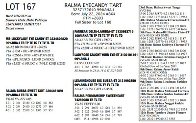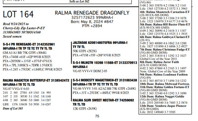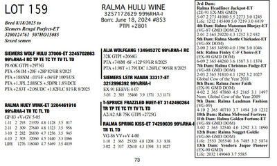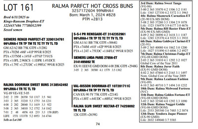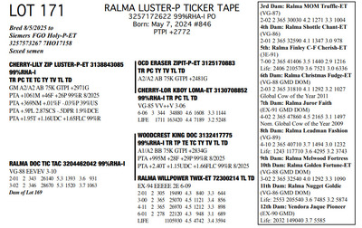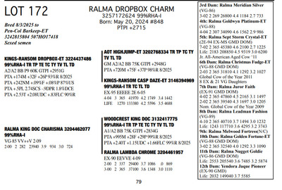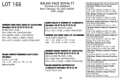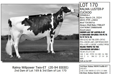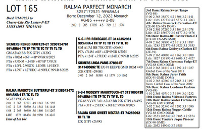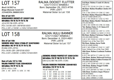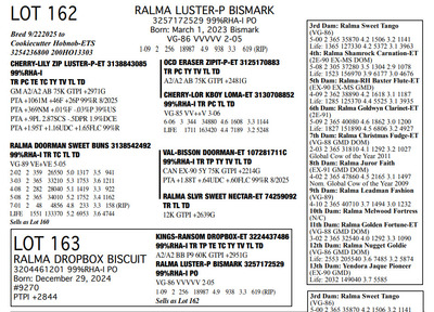 FAMILIES BUILT ON FAITH 16699 25th Ave NW , Rice MN, 56367 Great offering of genetics... Contact Agent: Aaron Ray Tompkins 336-363-4639 Catalog | Terms of Auction Download CATALOG Download SALE ORDER Download UPDATES Download ADDED LOT 175 Catalog | Terms Download CATALOG Download SALE ORDER Download UPDATES Download ADDED LOT 175 All Items (184) Cattle (184) Categories All Items (184) Cattle (184) Search Item #: Keyword: Search Catalog Item #: Keyword: 20 items per page 50 items per page 100 items per page Go to page #: 5 , 6 , 7 , 8 , 9 , 10 #158 – RALMA HULU BANNER 3257172667 99%RHA-I Born: December 4, 2024 #891 PTPI +2919 Maternal Sister to Lot 157 Location: 16699 25th Ave NW , Rice MN, 56367 Contact Agent: Aaron Ray Tompkins 336-363-4639 More Info / Bid Now Track this Item Sold High Bid: $2,600.00 – #19 #158 – RALMA HULU BANNER Sold High Bid: $2,600 More Details More Info / Bid Track Item 3257172667 99%RHA-I Born: December 4, 2024 #891 PTPI +2919 Maternal Sister to Lot 157 Location: 16699 25th Ave NW , Rice MN, 56367 Contact Agent: Aaron Ray Tompkins 336-363-4639 #159 – RALMA HULU WINE 3257172629 99%RHA-I Born: June 18, 2024 #853 PTPI +2801 Bred 8/18/2025 to Siemers Rengd Parfect-ET 3200124761 507HO15085 Sexed semen Location: 16699 25th Ave NW , Rice MN, 56367 Contact Agent: Aaron Ray Tompkins 336-363-4639 More Info / Bid Now Track this Item Sold High Bid: $3,500.00 – #500 #159 – RALMA HULU WINE Sold High Bid: $3,500 More Details More Info / Bid Track Item 3257172629 99%RHA-I Born: June 18, 2024 #853 PTPI +2801 Bred 8/18/2025 to Siemers Rengd Parfect-ET 3200124761 507HO15085 Sexed semen Location: 16699 25th Ave NW , Rice MN, 56367 Contact Agent: Aaron Ray Tompkins 336-363-4639 #160 – RALMA DOORMAN SWEET BUNS 3138542492 99%RHA-I TR TC TL TD Born: June 21, 2018 Swtbuns VG-89 VE+VE 5-05 Dam of Lots 161 & 162 2-02 2 359 26550 5.0 1317 3.5 941 3-03 2 365 33210 5.3 1753 3.6 1211 4-08 2 282 28040 5.0 1419 3.3 922 5-08 2 365 34010 5.2 1752 3.4 1162 7-01 2 48 4856 4.8 233 3.3 158 (RIP) LIFE 1551 133370 5.2 6953 3.6 4744 Sells Fresh 7/25/2025 Bred 9/12/2025 to MB-Luckylady Bullseye-ET 3234629819 200HO12370 Location: 16699 25th Ave NW , Rice MN, 56367 Contact Agent: Aaron Ray Tompkins 336-363-4639 More Info / Bid Now Track this Item Sold High Bid: $4,400.00 – #26 #160 – RALMA DOORMAN SWEET BUNS Sold High Bid: $4,400 More Details More Info / Bid Track Item 3138542492 99%RHA-I TR TC TL TD Born: June 21, 2018 Swtbuns VG-89 VE+VE 5-05 Dam of Lots 161 & 162 2-02 2 359 26550 5.0 1317 3.5 941 3-03 2 365 33210 5.3 1753 3.6 1211 4-08 2 282 28040 5.0 1419 3.3 922 5-08 2 365 34010 5.2 1752 3.4 1162 7-01 2 48 4856 4.8 233 3.3 158 (RIP) LIFE 1551 133370 5.2 6953 3.6 4744 Sells Fresh 7/25/2025 Bred 9/12/2025 to MB-Luckylady Bullseye-ET 3234629819 200HO12370 Location: 16699 25th Ave NW , Rice MN, 56367 Contact Agent: Aaron Ray Tompkins 336-363-4639 #161 – RALMA PARFCT HOT CROSS BUNS 3257172604 99%RHA-I Born: March 1, 2024 #828 PTPI +2813 Bred 6/11/2025 to Kings-Ransom Dropbox-ET 3224437486 777HO12399 Sexed semen Location: 16699 25th Ave NW , Rice MN, 56367 Contact Agent: Aaron Ray Tompkins 336-363-4639 More Info / Bid Now Track this Item Sold High Bid: $4,200.00 – #11 #161 – RALMA PARFCT HOT CROSS BUNS Sold High Bid: $4,200 More Details More Info / Bid Track Item 3257172604 99%RHA-I Born: March 1, 2024 #828 PTPI +2813 Bred 6/11/2025 to Kings-Ransom Dropbox-ET 3224437486 777HO12399 Sexed semen Location: 16699 25th Ave NW , Rice MN, 56367 Contact Agent: Aaron Ray Tompkins 336-363-4639 #162 – RALMA LUSTER-P BISMARK 3257172529 99%RHA-I PO Born: March 1, 2023 Bismark VG-86 VVVVV 2-05 1-09 2 256 18987 4.9 938 3.3 619 (RIP) Bred 9/222025 to Cookiecutter Hobnob-ETS 3254236800 200HO13303 Location: 16699 25th Ave NW , Rice MN, 56367 Contact Agent: Aaron Ray Tompkins 336-363-4639 More Info / Bid Now Track this Item Sold High Bid: $4,500.00 – #10 #162 – RALMA LUSTER-P BISMARK Sold High Bid: $4,500 More Details More Info / Bid Track Item 3257172529 99%RHA-I PO Born: March 1, 2023 Bismark VG-86 VVVVV 2-05 1-09 2 256 18987 4.9 938 3.3 619 (RIP) Bred 9/222025 to Cookiecutter Hobnob-ETS 3254236800 200HO13303 Location: 16699 25th Ave NW , Rice MN, 56367 Contact Agent: Aaron Ray Tompkins 336-363-4639 #163 – RALMA DROPBOX BISCUIT 3204461201 99%RHA-I PO Born: December 29, 2024 #9270 PTPI +2844 Location: 16699 25th Ave NW , Rice MN, 56367 Contact Agent: Aaron Ray Tompkins 336-363-4639 More Info / Bid Now Track this Item Sold High Bid: $2,800.00 – #1 #163 – RALMA DROPBOX BISCUIT Sold High Bid: $2,800 More Details More Info / Bid Track Item 3204461201 99%RHA-I PO Born: December 29, 2024 #9270 PTPI +2844 Location: 16699 25th Ave NW , Rice MN, 56367 Contact Agent: Aaron Ray Tompkins 336-363-4639 #164 – RALMA RENEGADE DRAGONFLY 3257172623 99%RHA-I Born: May 8, 2024 #847 PTPI +2894 Bred 9/24/2025 to Cherry-Lily Zip Luster-P-ET 3138843085 507HO14160 Sexed semen Location: 16699 25th Ave NW , Rice MN, 56367 Contact Agent: Aaron Ray Tompkins 336-363-4639 More Info / Bid Now Track this Item Sold High Bid: $3,000.00 – #23 #164 – RALMA RENEGADE DRAGONFLY Sold High Bid: $3,000 More Details More Info / Bid Track Item 3257172623 99%RHA-I Born: May 8, 2024 #847 PTPI +2894 Bred 9/24/2025 to Cherry-Lily Zip Luster-P-ET 3138843085 507HO14160 Sexed semen Location: 16699 25th Ave NW , Rice MN, 56367 Contact Agent: Aaron Ray Tompkins 336-363-4639 #165 – RALMA PARFECT MONARCH 3257172521 99%RHA-I Born: December 12, 2022 Monarch VG-85 ++++v 2-08 2-02 2 205 17695 4.5 799 3.3 578 Bred 7/14/2025 to Cherry-Lily Zip Luster-P-ET 3138843085 7HO14160 Location: 16699 25th Ave NW , Rice MN, 56367 Contact Agent: Aaron Ray Tompkins 336-363-4639 More Info / Bid Now Track this Item Sold High Bid: $3,900.00 – #55 #165 – RALMA PARFECT MONARCH Sold High Bid: $3,900 More Details More Info / Bid Track Item 3257172521 99%RHA-I Born: December 12, 2022 Monarch VG-85 ++++v 2-08 2-02 2 205 17695 4.5 799 3.3 578 Bred 7/14/2025 to Ch