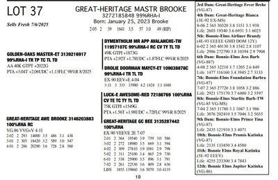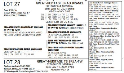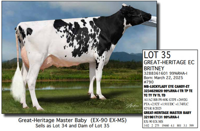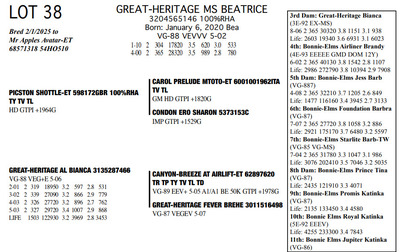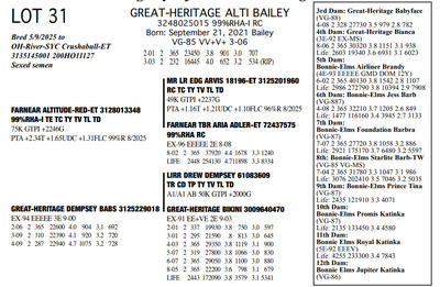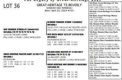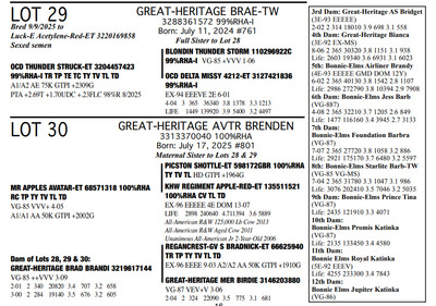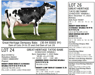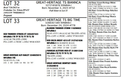 The Legacy of Great-Heritage N2454 State Hwy 55, Kaukauna WI, 54130 Great offering of genetics... Contact Agent: Aaron Ray Tompkins 336-363-4639 Catalog | Terms of Auction Download CATALOG Download UPDATES Download ADDED LOTS 133-135 Download ADDED LOTS 136-137 Download SALE ORDER Catalog | Terms Download CATALOG Download UPDATES Download ADDED LOTS 133-135 Download ADDED LOTS 136-137 Download SALE ORDER All Items (142) Cattle (142) Categories All Items (142) Cattle (142) Search Item #: Keyword: Search Catalog Item #: Keyword: 20 items per page 50 items per page 100 items per page Go to page #: 1 , 2 , 3 , 4 , 5 , 6 #21 – LUCK-E DOC ALBATROZ 3228494379 99%RHA-I RC TC TL TD Born: March 4, 2021 Albatrz EX-91 EEEVE 4-04 2-05 2 352 22710 4.9 1124 3.6 817 3-06 2 334 29328 4.7 1391 3.4 1007 (RIP) Bred 8/4/2025 to Golden-Oaks Master-ET 3139216917 799HO00016 Pregnant Location: N2454 State Hwy 55, Kaukauna WI, 54130 Contact Agent: Aaron Ray Tompkins 336-363-4639 More Info / Bid Now Track this Item Sold High Bid: $5,700.00 – #9 #21 – LUCK-E DOC ALBATROZ Sold High Bid: $5,700 More Details More Info / Bid Track Item 3228494379 99%RHA-I RC TC TL TD Born: March 4, 2021 Albatrz EX-91 EEEVE 4-04 2-05 2 352 22710 4.9 1124 3.6 817 3-06 2 334 29328 4.7 1391 3.4 1007 (RIP) Bred 8/4/2025 to Golden-Oaks Master-ET 3139216917 799HO00016 Pregnant Location: N2454 State Hwy 55, Kaukauna WI, 54130 Contact Agent: Aaron Ray Tompkins 336-363-4639 #21A – ET Female #804 Red ET Female #804 Red Name & Number Pending Born: September 8, 2025 Location: N2454 State Hwy 55, Kaukauna WI, 54130 Contact Agent: Aaron Ray Tompkins 336-363-4639 More Info / Bid Now Track this Item Sold High Bid: $3,600.00 – #1065 #21A – ET Female #804 Red Sold High Bid: $3,600 More Details More Info / Bid Track Item ET Female #804 Red Name & Number Pending Born: September 8, 2025 Location: N2454 State Hwy 55, Kaukauna WI, 54130 Contact Agent: Aaron Ray Tompkins 336-363-4639 #21B – ET Female #805 Black ET Female #805 Black Name & Number Pending Born: September 12, 2025 Location: N2454 State Hwy 55, Kaukauna WI, 54130 Contact Agent: Aaron Ray Tompkins 336-363-4639 More Info / Bid Now Track this Item Sold High Bid: $2,800.00 – #58 #21B – ET Female #805 Black Sold High Bid: $2,800 More Details More Info / Bid Track Item ET Female #805 Black Name & Number Pending Born: September 12, 2025 Location: N2454 State Hwy 55, Kaukauna WI, 54130 Contact Agent: Aaron Ray Tompkins 336-363-4639 #22 – LUCK-E HULU ATLAS-RED-MALE 3288361610 99%RHA-I TC TL TD Born: September 14, 2024 #799 Z2/Z2 BB P5 43K GTPI +2659G **MALE** Location: N2454 State Hwy 55, Kaukauna WI, 54130 Contact Agent: Aaron Ray Tompkins 336-363-4639 More Info / Bid Now Track this Item Sold High Bid: $2,700.00 – #8 #22 – LUCK-E HULU ATLAS-RED-MALE Sold High Bid: $2,700 More Details More Info / Bid Track Item 3288361610 99%RHA-I TC TL TD Born: September 14, 2024 #799 Z2/Z2 BB P5 43K GTPI +2659G **MALE** Location: N2454 State Hwy 55, Kaukauna WI, 54130 Contact Agent: Aaron Ray Tompkins 336-363-4639 #23 – GREAT-HERITAGE CRU BESS 3219617149 99%RHA-I Born: September 6, 2021 Bess VG-86 VVV+V 3-06 3-01 2 292 21984 4.0 874 3.2 695 (RIP) Bred 1/27/2025 Siemers Hanan Hanx-P 3243939096 7HO16387 Location: N2454 State Hwy 55, Kaukauna WI, 54130 Contact Agent: Aaron Ray Tompkins 336-363-4639 More Info / Bid Now Track this Item Sold High Bid: $3,800.00 – #12 #23 – GREAT-HERITAGE CRU BESS Sold High Bid: $3,800 More Details More Info / Bid Track Item 3219617149 99%RHA-I Born: September 6, 2021 Bess VG-86 VVV+V 3-06 3-01 2 292 21984 4.0 874 3.2 695 (RIP) Bred 1/27/2025 Siemers Hanan Hanx-P 3243939096 7HO16387 Location: N2454 State Hwy 55, Kaukauna WI, 54130 Contact Agent: Aaron Ray Tompkins 336-363-4639 #24 – GREAT-HERITAGE TATOO BABE 3248025045 99%RHA-I Born: September 1, 2022 Babe VG-85 +V++V 2-06 2-03 25413998 3.8537 3.2449 (RIP) Bred 4/23/2025 to Walnutlawn Sidekick 12508113 200HO10992 Pregnant Location: N2454 State Hwy 55, Kaukauna WI, 54130 Contact Agent: Aaron Ray Tompkins 336-363-4639 More Info / Bid Now Track this Item Sold High Bid: $3,600.00 – #23 #24 – GREAT-HERITAGE TATOO BABE Sold High Bid: $3,600 More Details More Info / Bid Track Item 3248025045 99%RHA-I Born: September 1, 2022 Babe VG-85 +V++V 2-06 2-03 25413998 3.8537 3.2449 (RIP) Bred 4/23/2025 to Walnutlawn Sidekick 12508113 200HO10992 Pregnant Location: N2454 State Hwy 55, Kaukauna WI, 54130 Contact Agent: Aaron Ray Tompkins 336-363-4639 #25 – GREAT-HERITAGE MASTER BARB 3272185872 99%RHA-I Bred 6/9/2025 to Born: September 3, 2023 #726 OH-River-SYC Crushabull-ET 3135145001 200HO11127 Pregnant-Sexed semen Location: N2454 State Hwy 55, Kaukauna WI, 54130 Contact Agent: Aaron Ray Tompkins 336-363-4639 More Info / Bid Now Track this Item Sold High Bid: $3,200.00 – #47 #25 – GREAT-HERITAGE MASTER BARB Sold High Bid: $3,200 More Details More Info / Bid Track Item 3272185872 99%RHA-I Bred 6/9/2025 to Born: September 3, 2023 #726 OH-River-SYC Crushabull-ET 3135145001 200HO11127 Pregnant-Sexed semen Location: N2454 State Hwy 55, Kaukauna WI, 54130 Contact Agent: Aaron Ray Tompkins 336-363-4639 #26 – GREAT-HERITAGE TATO BETHANY 3248025061 99%RHA-I Born: December 17, 2022 Bethany Sells Fresh 7/8/2025 2-06 2 37 1931 4.0 78 3.2 62 (RIP) Location: N2454 State Hwy 55, Kaukauna WI, 54130 Contact Agent: Aaron Ray Tompkins 336-363-4639 More Info / Bid Now Track this Item Sold High Bid: $3,700.00 – #44 #26 – GREAT-HERITAGE TATO BETHANY Sold High Bid: $3,700 More Details More Info / Bid Track Item 3248025061 99%RHA-I Born: December 17, 2022 Bethany Sells Fresh 7/8/2025 2-06 2 37 1931 4.0 78 3.2 62 (RIP) Location: N2454 State Hwy 55, Kaukauna WI, 54130 Contact Agent: Aaron Ray Tompkins 336-363-4639 #27 – GREAT-HERITAGE BRAD BRANDI 3219617144 100%RHA Born: June 13, 2021 Brandi VG-85 ++VVV 3-09 Dam of Lots 28, 29 & 30 2-01 2 340 20820 3.4 707 3.2 658 3-00 2 284 19140 3.5 676 3.2 605 4-01 2 26 2036 3.9 79 3.4 69 (RIP) Bred 9/