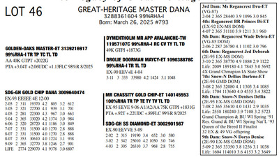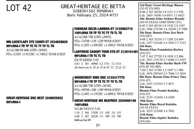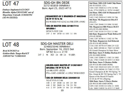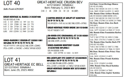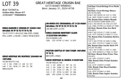 The Legacy of Great-Heritage N2454 State Hwy 55, Kaukauna WI, 54130 Great offering of genetics... Contact Agent: Aaron Ray Tompkins 336-363-4639 Catalog | Terms of Auction Download CATALOG Download UPDATES Download ADDED LOTS 133-135 Download ADDED LOTS 136-137 Download SALE ORDER Catalog | Terms Download CATALOG Download UPDATES Download ADDED LOTS 133-135 Download ADDED LOTS 136-137 Download SALE ORDER All Items (142) Cattle (142) Categories All Items (142) Cattle (142) Search Item #: Keyword: Search Catalog Item #: Keyword: 20 items per page 50 items per page 100 items per page Go to page #: 1 , 2 , 3 , 4 , 5 , 6 #39 – GREAT-HERITAGE CRUISIN BAE 3272185884 99%RHA-I Born: January 31, 2024 #738 Bred 7/25/2025 to Golden-Oaks Master-ET 3139216917 799HO00016 Location: N2454 State Hwy 55, Kaukauna WI, 54130 Contact Agent: Aaron Ray Tompkins 336-363-4639 More Info / Bid Now Track this Item Sold High Bid: $3,000.00 – #47 #39 – GREAT-HERITAGE CRUISIN BAE Sold High Bid: $3,000 More Details More Info / Bid Track Item 3272185884 99%RHA-I Born: January 31, 2024 #738 Bred 7/25/2025 to Golden-Oaks Master-ET 3139216917 799HO00016 Location: N2454 State Hwy 55, Kaukauna WI, 54130 Contact Agent: Aaron Ray Tompkins 336-363-4639 #40 – GREAT-HERITAGE CRUISIN BEV T-HERITAGE CRUISIN BEV 3272185851 99%RHA-I Born: February 5, 2023 BEV 2-04 2 46 2328 3.6 83 2.8 66 (RIP) Sells Fresh 6/29/2025 Location: N2454 State Hwy 55, Kaukauna WI, 54130 Contact Agent: Aaron Ray Tompkins 336-363-4639 More Info / Bid Now Track this Item Sold High Bid: $2,800.00 – #12 #40 – GREAT-HERITAGE CRUISIN BEV Sold High Bid: $2,800 More Details More Info / Bid Track Item T-HERITAGE CRUISIN BEV 3272185851 99%RHA-I Born: February 5, 2023 BEV 2-04 2 46 2328 3.6 83 2.8 66 (RIP) Sells Fresh 6/29/2025 Location: N2454 State Hwy 55, Kaukauna WI, 54130 Contact Agent: Aaron Ray Tompkins 336-363-4639 #41 – GREAT-HERITAGE EC BELL 3313370041 99%RHA-I Born: June 29, 2025 #802 Location: N2454 State Hwy 55, Kaukauna WI, 54130 Contact Agent: Aaron Ray Tompkins 336-363-4639 More Info / Bid Now Track this Item Sold High Bid: $1,400.00 – #19 #41 – GREAT-HERITAGE EC BELL Sold High Bid: $1,400 More Details More Info / Bid Track Item 3313370041 99%RHA-I Born: June 29, 2025 #802 Location: N2454 State Hwy 55, Kaukauna WI, 54130 Contact Agent: Aaron Ray Tompkins 336-363-4639 #42 – GREAT-HERITAGE EC BETTA 3288361562 99%RHA-I Born: February 25, 2024 #751 Location: N2454 State Hwy 55, Kaukauna WI, 54130 Contact Agent: Aaron Ray Tompkins 336-363-4639 More Info / Bid Now Track this Item Sold High Bid: $2,200.00 – #38 #42 – GREAT-HERITAGE EC BETTA Sold High Bid: $2,200 More Details More Info / Bid Track Item 3288361562 99%RHA-I Born: February 25, 2024 #751 Location: N2454 State Hwy 55, Kaukauna WI, 54130 Contact Agent: Aaron Ray Tompkins 336-363-4639 #43 – GREAT-HERITAGE LAMDA DEB-ET 3288361591 100%RHA Born: December 26, 2024 #780 Location: N2454 State Hwy 55, Kaukauna WI, 54130 Contact Agent: Aaron Ray Tompkins 336-363-4639 More Info / Bid Now Track this Item Sold High Bid: $3,400.00 – #1009 #43 – GREAT-HERITAGE LAMDA DEB-ET Sold High Bid: $3,400 More Details More Info / Bid Track Item 3288361591 100%RHA Born: December 26, 2024 #780 Location: N2454 State Hwy 55, Kaukauna WI, 54130 Contact Agent: Aaron Ray Tompkins 336-363-4639 #44 – GREAT-HERITAGE LAMB DEAL-ET 3288361592 100%RHA Born: December 28, 2024 #781 Location: N2454 State Hwy 55, Kaukauna WI, 54130 Contact Agent: Aaron Ray Tompkins 336-363-4639 More Info / Bid Now Track this Item Sold High Bid: $3,300.00 – #21 #44 – GREAT-HERITAGE LAMB DEAL-ET Sold High Bid: $3,300 More Details More Info / Bid Track Item 3288361592 100%RHA Born: December 28, 2024 #781 Location: N2454 State Hwy 55, Kaukauna WI, 54130 Contact Agent: Aaron Ray Tompkins 336-363-4639 #45 – GREAT-HERITAGE LAM DIANE-ET 3288361608 100%RHA Born: May 10, 2025 #797 Location: N2454 State Hwy 55, Kaukauna WI, 54130 Contact Agent: Aaron Ray Tompkins 336-363-4639 More Info / Bid Now Track this Item Sold High Bid: $2,800.00 – #1033 #45 – GREAT-HERITAGE LAM DIANE-ET Sold High Bid: $2,800 More Details More Info / Bid Track Item 3288361608 100%RHA Born: May 10, 2025 #797 Location: N2454 State Hwy 55, Kaukauna WI, 54130 Contact Agent: Aaron Ray Tompkins 336-363-4639 #46 – GREAT-HERITAGE MASTER DANA 3288361604 99%RHA-I Born: March 26, 2025 #793 Location: N2454 State Hwy 55, Kaukauna WI, 54130 Contact Agent: Aaron Ray Tompkins 336-363-4639 More Info / Bid Now Track this Item Sold High Bid: $2,300.00 – #1029 #46 – GREAT-HERITAGE MASTER DANA Sold High Bid: $2,300 More Details More Info / Bid Track Item 3288361604 99%RHA-I Born: March 26, 2025 #793 Location: N2454 State Hwy 55, Kaukauna WI, 54130 Contact Agent: Aaron Ray Tompkins 336-363-4639 #47 – SDG-GH BN DEDE 272185859 99%RHA-I Born: April 23, 2023 #713 Embryo Implanted 6/23/2025 Blondin Alpha120345248C out of Mayerlane Catwalk 3130383594 (3E-94 EEEEE) Location: N2454 State Hwy 55, Kaukauna WI, 54130 Contact Agent: Aaron Ray Tompkins 336-363-4639 More Info / Bid Now Track this Item Sold High Bid: $3,600.00 – #47 #47 – SDG-GH BN DEDE Sold High Bid: $3,600 More Details More Info / Bid Track Item 272185859 99%RHA-I Born: April 23, 2023 #713 Embryo Implanted 6/23/2025 Blondin Alpha120345248C out of Mayerlane Catwalk 3130383594 (3E-94 EEEEE) Location: N2454 State Hwy 55, Kaukauna WI, 54130 Contact Agent: Aaron Ray Tompkins 336-363-4639 #48 – SDG-GH MASTER DELI 3248025046 99%RHA-I Born: September 16, 2022 Deli GP-82 G++++ 2-10 2-07 2 96 3823 2.6 100 2.4 93 (RIP) Bred 8/29/2025 to Golden-Oaks Tango-Red-ET 3209185764 712HO1018 Location: N2454 State Hwy 55, Kaukauna WI, 54130 Contact Agent: Aaron Ray Tompkins 336-363-4639 More Info / Bid Now Track this Item Sold High Bid: $3,300.00 – #1 #48 – SDG-GH MASTER DELI Sold High Bid: $3,300 More Details More Info / Bid Track Item 3248025046 99%RHA-I Born: September 16, 2022 Deli GP-82 G++++ 2-10 2-07 2 96 3823 2.6 100 2.4 