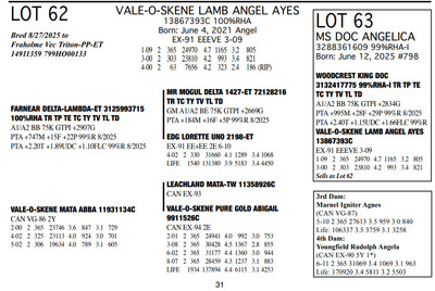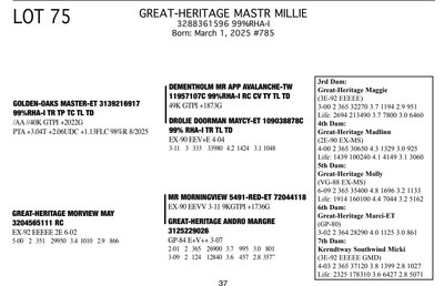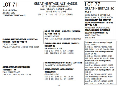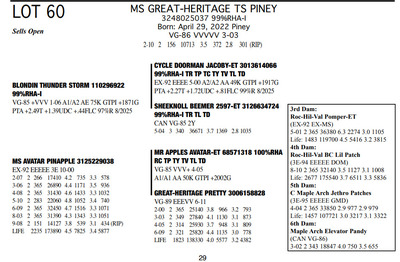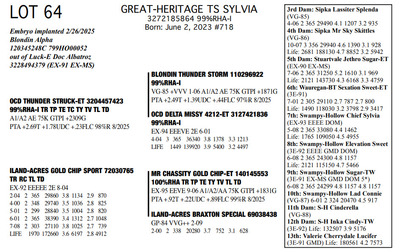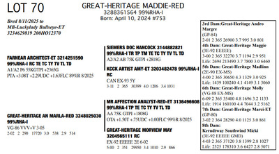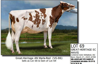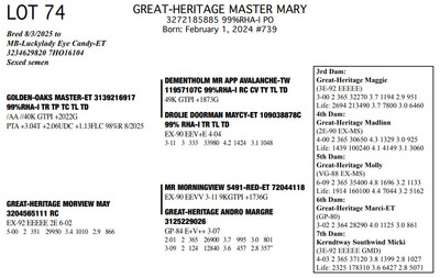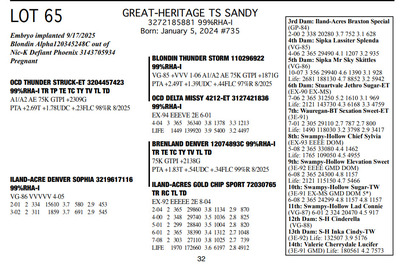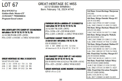 The Legacy of Great-Heritage N2454 State Hwy 55, Kaukauna WI, 54130 Great offering of genetics... Contact Agent: Aaron Ray Tompkins 336-363-4639 Catalog | Terms of Auction Download CATALOG Download UPDATES Download ADDED LOTS 133-135 Download ADDED LOTS 136-137 Download SALE ORDER Catalog | Terms Download CATALOG Download UPDATES Download ADDED LOTS 133-135 Download ADDED LOTS 136-137 Download SALE ORDER All Items (142) Cattle (142) Categories All Items (142) Cattle (142) Search Item #: Keyword: Search Catalog Item #: Keyword: 20 items per page 50 items per page 100 items per page Go to page #: 2 , 3 , 4 , 5 , 6 , 7 #57 – GREAT-HERITAGE MANDY-RED-ET 3272185867 99%RHA-I Born: July 23, 2023 #721 Full Sister to Lots 55 & 57 Embryo implanted 2/26/2025 Blondin Alpha-ET 120345248 799HO00052 out of Mayerlane Catwalk 3130383594 (3E-94 EEEEE) Pregnant Location: N2454 State Hwy 55, Kaukauna WI, 54130 Contact Agent: Aaron Ray Tompkins 336-363-4639 More Info / Bid Now Track this Item Sold High Bid: $4,500.00 – #39 #57 – GREAT-HERITAGE MANDY-RED-ET Sold High Bid: $4,500 More Details More Info / Bid Track Item 3272185867 99%RHA-I Born: July 23, 2023 #721 Full Sister to Lots 55 & 57 Embryo implanted 2/26/2025 Blondin Alpha-ET 120345248 799HO00052 out of Mayerlane Catwalk 3130383594 (3E-94 EEEEE) Pregnant Location: N2454 State Hwy 55, Kaukauna WI, 54130 Contact Agent: Aaron Ray Tompkins 336-363-4639 #58 – HILROSE DOC PANDA 3204898175 99%RHA-I Born: December 7, 2020 Panda EX-91 EEVVE 4-03 2-00 2 330 26770 4.2 1125 3.1 825 3-01 2 325 26670 3.9 1048 3.2 845 4-01 2 206 19397 3.8 736 2.9 563 (RIP) Bred 3/18/2025 to MB-Luckylady Eye Candy-ET 3234629820 7HO16104 Sexed semen Location: N2454 State Hwy 55, Kaukauna WI, 54130 Contact Agent: Aaron Ray Tompkins 336-363-4639 More Info / Bid Now Track this Item Sold High Bid: $5,250.00 – #1011 #58 – HILROSE DOC PANDA Sold High Bid: $5,250 More Details More Info / Bid Track Item 3204898175 99%RHA-I Born: December 7, 2020 Panda EX-91 EEVVE 4-03 2-00 2 330 26770 4.2 1125 3.1 825 3-01 2 325 26670 3.9 1048 3.2 845 4-01 2 206 19397 3.8 736 2.9 563 (RIP) Bred 3/18/2025 to MB-Luckylady Eye Candy-ET 3234629820 7HO16104 Sexed semen Location: N2454 State Hwy 55, Kaukauna WI, 54130 Contact Agent: Aaron Ray Tompkins 336-363-4639 #59 – HILROSE DROPBOX PEG 3288361595 99%RHA-I Born: January 18, 2025 #784 Location: N2454 State Hwy 55, Kaukauna WI, 54130 Contact Agent: Aaron Ray Tompkins 336-363-4639 More Info / Bid Now Track this Item Sold High Bid: $2,700.00 – #55 #59 – HILROSE DROPBOX PEG Sold High Bid: $2,700 More Details More Info / Bid Track Item 3288361595 99%RHA-I Born: January 18, 2025 #784 Location: N2454 State Hwy 55, Kaukauna WI, 54130 Contact Agent: Aaron Ray Tompkins 336-363-4639 #60 – MS GREAT-HERITAGE TS PINEY 3248025037 99%RHA-I Born: April 29, 2022 Piney VG-86 VVVVV 3-03 2-10 2 156 10713 3.5 372 2.8 301 (RIP) Sells Open Location: N2454 State Hwy 55, Kaukauna WI, 54130 Contact Agent: Aaron Ray Tompkins 336-363-4639 More Info / Bid Now Track this Item Sold High Bid: $7,750.00 – #31 #60 – MS GREAT-HERITAGE TS PINEY Sold High Bid: $7,750 More Details More Info / Bid Track Item 3248025037 99%RHA-I Born: April 29, 2022 Piney VG-86 VVVVV 3-03 2-10 2 156 10713 3.5 372 2.8 301 (RIP) Sells Open Location: N2454 State Hwy 55, Kaukauna WI, 54130 Contact Agent: Aaron Ray Tompkins 336-363-4639 #61 – GREAT-HERITAGE EC BARB 3288361570 99%RHA-I Born: June 7, 2024 #759 Bred 9/21/2025 to Fraholme Vec Triton-PP 14911359 799HO00133 Sexed semen Location: N2454 State Hwy 55, Kaukauna WI, 54130 Contact Agent: Aaron Ray Tompkins 336-363-4639 More Info / Bid Now Track this Item Sold High Bid: $4,600.00 – #31 #61 – GREAT-HERITAGE EC BARB Sold High Bid: $4,600 More Details More Info / Bid Track Item 3288361570 99%RHA-I Born: June 7, 2024 #759 Bred 9/21/2025 to Fraholme Vec Triton-PP 14911359 799HO00133 Sexed semen Location: N2454 State Hwy 55, Kaukauna WI, 54130 Contact Agent: Aaron Ray Tompkins 336-363-4639 #62 – VALE-O-SKENE LAMB ANGEL AYES 13867393C 100%RHA Born: June 4, 2021 Angel EX-91 EEEVE 3-09 1-09 2 365 24970 4.7 1165 3.2 805 3-00 2 303 23810 4.2 993 3.4 821 4-00 2 63 7656 4.2 323 2.4 186 (RIP) Bred 8/27/2025 to Fraholme Vec Triton-PP-ET 14911359 799HO00133 Location: N2454 State Hwy 55, Kaukauna WI, 54130 Contact Agent: Aaron Ray Tompkins 336-363-4639 More Info / Bid Now Track this Item Sold High Bid: $4,600.00 – #49 #62 – VALE-O-SKENE LAMB ANGEL AYES Sold High Bid: $4,600 More Details More Info / Bid Track Item 13867393C 100%RHA Born: June 4, 2021 Angel EX-91 EEEVE 3-09 1-09 2 365 24970 4.7 1165 3.2 805 3-00 2 303 23810 4.2 993 3.4 821 4-00 2 63 7656 4.2 323 2.4 186 (RIP) Bred 8/27/2025 to Fraholme Vec Triton-PP-ET 14911359 799HO00133 Location: N2454 State Hwy 55, Kaukauna WI, 54130 Contact Agent: Aaron Ray Tompkins 336-363-4639 #63 – MS DOC ANGELICA 3288361609 99%RHA-I Born: June 12, 2025 #798 Location: N2454 State Hwy 55, Kaukauna WI, 54130 Contact Agent: Aaron Ray Tompkins 336-363-4639 More Info / Bid Now Track this Item Sold High Bid: $2,200.00 – #21 #63 – MS DOC ANGELICA Sold High Bid: $2,200 More Details More Info / Bid Track Item 3288361609 99%RHA-I Born: June 12, 2025 #798 Location: N2454 State Hwy 55, Kaukauna WI, 54130 Contact Agent: Aaron Ray Tompkins 336-363-4639 #64 – GREAT-HERITAGE TS SYLVIA 3272185864 99%RHA-I Born: June 2, 2023 #718 Embryo implanted 2/26/2025 Blondin Alpha 120345248C 799HO00052 out of Luck-E Doc Albatroz 3228494379 (EX-91 EX-MS) Location: N2454 State Hwy 55, Kaukauna WI, 54130 Contact Agent: Aaron Ray Tompkins 336-363-4639 More Info / Bid Now Track this Item Sold High Bid: $4,700.00 – #47 #64 – GREAT-HERITAGE TS SYLVIA Sold High Bid: $4,700 More Details More Info / Bid Track Item 3272185864 99%RHA-I Born: June 2, 2023 #718 Embryo implanted 2/26/2025 Blondin Alpha 120345248C 799HO00052 out of Luck-E Doc Albatroz 3228494379 (EX-91 EX-MS) Location: N2454 State Hwy 55, Kaukauna WI, 54130 Contact Agent: Aaron Ra