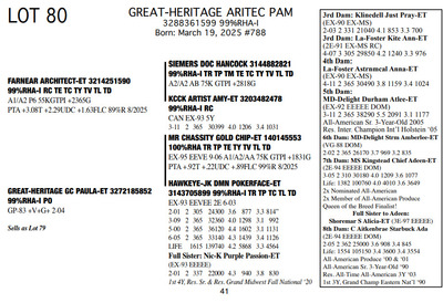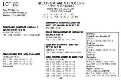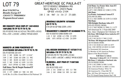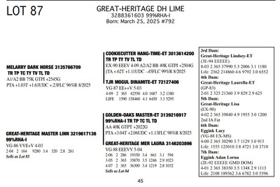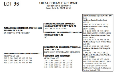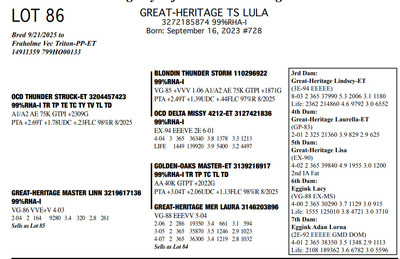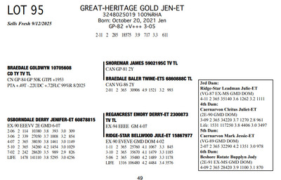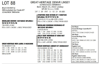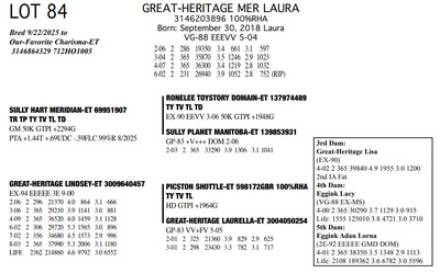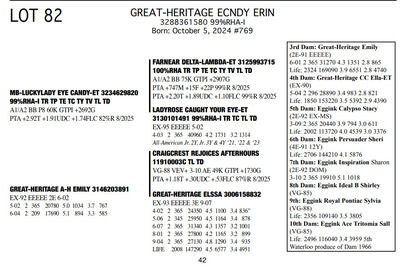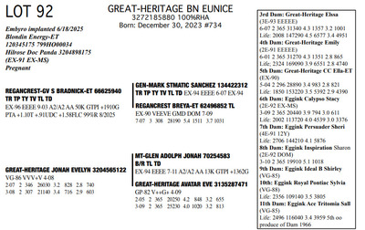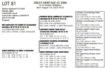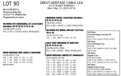 The Legacy of Great-Heritage N2454 State Hwy 55, Kaukauna WI, 54130 Great offering of genetics... Contact Agent: Aaron Ray Tompkins 336-363-4639 Catalog | Terms of Auction Download CATALOG Download UPDATES Download ADDED LOTS 133-135 Download ADDED LOTS 136-137 Download SALE ORDER Catalog | Terms Download CATALOG Download UPDATES Download ADDED LOTS 133-135 Download ADDED LOTS 136-137 Download SALE ORDER All Items (142) Cattle (142) Categories All Items (142) Cattle (142) Search Item #: Keyword: Search Catalog Item #: Keyword: 20 items per page 50 items per page 100 items per page Go to page #: 3 , 4 , 5 , 6 , 7 , 8 #77 – NIC-K DEFIANT PHOENIX 3143705934 99%RHA-I Born: December 1, 2017 Phoenix EX-94 EEEEE 2E 4-03 2 306 22080 3.6 786 3.2 705 5-03 2 308 21380 4.5 955 3.0 645 6-03 2 365 27460 4.4 1220 3.2 884 Sells Fresh 9/21/2025 Location: N2454 State Hwy 55, Kaukauna WI, 54130 Contact Agent: Aaron Ray Tompkins 336-363-4639 More Info / Bid Now Track this Item Sold High Bid: $5,400.00 – #1059 #77 – NIC-K DEFIANT PHOENIX Sold High Bid: $5,400 More Details More Info / Bid Track Item 3143705934 99%RHA-I Born: December 1, 2017 Phoenix EX-94 EEEEE 2E 4-03 2 306 22080 3.6 786 3.2 705 5-03 2 308 21380 4.5 955 3.0 645 6-03 2 365 27460 4.4 1220 3.2 884 Sells Fresh 9/21/2025 Location: N2454 State Hwy 55, Kaukauna WI, 54130 Contact Agent: Aaron Ray Tompkins 336-363-4639 #78 – GREAT-HERITAGE GC POLLY-ET 3272185855 99%RHA-I Born: March 9, 2023 #709 Sells Fresh 9/8/2025 Location: N2454 State Hwy 55, Kaukauna WI, 54130 Contact Agent: Aaron Ray Tompkins 336-363-4639 More Info / Bid Now Track this Item Sold High Bid: $3,600.00 – #1 #78 – GREAT-HERITAGE GC POLLY-ET Sold High Bid: $3,600 More Details More Info / Bid Track Item 3272185855 99%RHA-I Born: March 9, 2023 #709 Sells Fresh 9/8/2025 Location: N2454 State Hwy 55, Kaukauna WI, 54130 Contact Agent: Aaron Ray Tompkins 336-363-4639 #79 – GREAT-HERITAGE GC PAULA-ET 3272185852 99%RHA-I PO Born: March 1, 2023 Paula GP-83 +V+G+ 2-04 2-00 2 148 9867 3.4 334 2.7 271 (RIP) Bred 5/16/2025 to Blondin Energy-ET 120345175 799HO00034 Pregnant-Sexed semen Location: N2454 State Hwy 55, Kaukauna WI, 54130 Contact Agent: Aaron Ray Tompkins 336-363-4639 More Info / Bid Now Track this Item Sold High Bid: $4,200.00 – #21 #79 – GREAT-HERITAGE GC PAULA-ET Sold High Bid: $4,200 More Details More Info / Bid Track Item 3272185852 99%RHA-I PO Born: March 1, 2023 Paula GP-83 +V+G+ 2-04 2-00 2 148 9867 3.4 334 2.7 271 (RIP) Bred 5/16/2025 to Blondin Energy-ET 120345175 799HO00034 Pregnant-Sexed semen Location: N2454 State Hwy 55, Kaukauna WI, 54130 Contact Agent: Aaron Ray Tompkins 336-363-4639 #80 – GREAT-HERITAGE ARITEC PAM 3288361599 99%RHA-I Born: March 19, 2025 #788 Location: N2454 State Hwy 55, Kaukauna WI, 54130 Contact Agent: Aaron Ray Tompkins 336-363-4639 More Info / Bid Now Track this Item Sold High Bid: $2,400.00 – #19 #80 – GREAT-HERITAGE ARITEC PAM Sold High Bid: $2,400 More Details More Info / Bid Track Item 3288361599 99%RHA-I Born: March 19, 2025 #788 Location: N2454 State Hwy 55, Kaukauna WI, 54130 Contact Agent: Aaron Ray Tompkins 336-363-4639 #81 – GREAT-HERITAGE EC ERIN 3272185869 99%RHA-I Born: August 16, 2023 #723 Embryo implanted 3/27/2025 Blondin Alpha 120345248C out of Luck-E Doc Albatroz 3228494379 (EX-91 EX-MS) Pregnan Location: N2454 State Hwy 55, Kaukauna WI, 54130 Contact Agent: Aaron Ray Tompkins 336-363-4639 More Info / Bid Now Track this Item Sold High Bid: $4,300.00 – #47 #81 – GREAT-HERITAGE EC ERIN Sold High Bid: $4,300 More Details More Info / Bid Track Item 3272185869 99%RHA-I Born: August 16, 2023 #723 Embryo implanted 3/27/2025 Blondin Alpha 120345248C out of Luck-E Doc Albatroz 3228494379 (EX-91 EX-MS) Pregnan Location: N2454 State Hwy 55, Kaukauna WI, 54130 Contact Agent: Aaron Ray Tompkins 336-363-4639 #82 – GREAT-HERITAGE ECNDY ERIN 3288361580 99%RHA-I Born: October 5, 2024 #769 Location: N2454 State Hwy 55, Kaukauna WI, 54130 Contact Agent: Aaron Ray Tompkins 336-363-4639 More Info / Bid Now Track this Item Sold High Bid: $2,700.00 – #15 #82 – GREAT-HERITAGE ECNDY ERIN Sold High Bid: $2,700 More Details More Info / Bid Track Item 3288361580 99%RHA-I Born: October 5, 2024 #769 Location: N2454 State Hwy 55, Kaukauna WI, 54130 Contact Agent: Aaron Ray Tompkins 336-363-4639 #83 – FARNEAR EYE CANDY 8853-ET 3264176821 99%RHA-I TR TP TC TL TD A1/A1 BE 32K GTPI +2422G Born: December 6, 2023 #8853 Embryo implanted 9/4/2025 Blondin Alpha120345248C out of ET Hawkeye-JK DMN Pokerface-ET 3143705899 Location: N2454 State Hwy 55, Kaukauna WI, 54130 Contact Agent: Aaron Ray Tompkins 336-363-4639 More Info / Bid Now Track this Item No Bids Starting at $1,000.00 Login to Bid #83 – FARNEAR EYE CANDY 8853-ET Starting at $1,000.00 Login to Bid More Details More Info / Bid Track Item 3264176821 99%RHA-I TR TP TC TL TD A1/A1 BE 32K GTPI +2422G Born: December 6, 2023 #8853 Embryo implanted 9/4/2025 Blondin Alpha120345248C out of ET Hawkeye-JK DMN Pokerface-ET 3143705899 Location: N2454 State Hwy 55, Kaukauna WI, 54130 Contact Agent: Aaron Ray Tompkins 336-363-4639 #84 – GREAT-HERITAGE MER LAURA 3146203896 100%RHA Born: September 30, 2018 Laura VG-88 EEEVV 5-04 2-06 2 286 19350 3.4 661 3.1 597 3-04 2 365 35870 3.5 1246 2.9 1023 4-07 2 365 36300 3.4 1219 2.8 1032 6-02 2 231 26940 3.9 1052 2.8 752 (RIP) Bred 9/22/2025 to Our-Favorite Charisma-ET 3146864329 712HO1005 Location: N2454 State Hwy 55, Kaukauna WI, 54130 Contact Agent: Aaron Ray Tompkins 336-363-4639 More Info / Bid Now Track this Item Sold High Bid: $1,700.00 – #1003 #84 – GREAT-HERITAGE MER LAURA Sold High Bid: $1,700 More Details More Info / Bid Track Item 3146203896 100%RHA Born: September 30, 2018 Laura VG-88 EEEVV 5-04 2-06 2 286 19350 3.4 661 3.1 597 3-04 2 365 35870 3.5 1246 2.9 1023 4-07 2 365 36300 3.4 1219 2.8 1032 6-02 2 231 26940 3.9 1052 2.8 752 (RIP) Bred 9/22/2025 to Our-Favorite Charisma-ET 3146864329 712HO1005 Location: N2454 State Hwy 55, 
