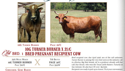 Bred recipient cow, due April 2026, sex of the calf unknown. Turner Burner is among the very best sires in the industry. 21C is a Brutus, Big Shot female. 21C is a producer already with her calf, Star Struck, who won the Texas Cattle Raisers Futurity in San Antonio. He also has LTE over $47,000. Recipient cow ready to pick up in Anson, TX at your convenience.