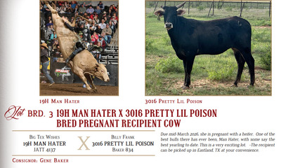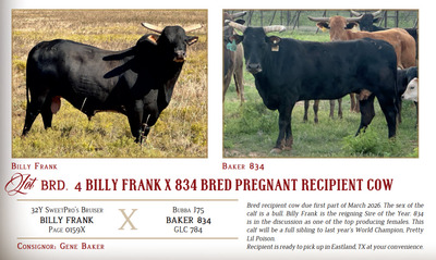 Bred recipient cow due first part of March 2026. The sex of the calf is a bull. Billy Frank is the reigning Sire of the Year. 834 is in the discussion as one of the top producing females. This calf will be a full sibling to last year’s World Champion, Pretty Lil Poison. Recipient is ready to pick up in Eastland, TX at your convenience