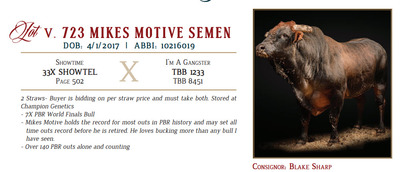 2 Straws- Buyer is bidding on per straw price and must take both. Stored at Champion Genetics - 7X PBR World Finals Bull - Mikes Motive holds the record for most outs in PBR history and may set all time outs record before he is retired. He loves bucking more than any bull I have seen. - Over 140 PBR outs alone and counting