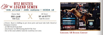 2 Straws- Buyer is bidding on per straw price and must take both. Stored at Champion Genetics - 3X PBR World Finals Bull - 2023 Runner-Up PBR Bucking Bull Of The Year - One of the most athletic bulls the world has ever seen.