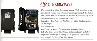 The MagnaWave Julian Duo is two analog PEMF machines in one portable, all-terrain case. Wherever you’re operating at, the Julian Duo allows two attachments to be used simultaneously with independent intensity settings and time! Julian Duo Two Times the Machine. 23 x 16 x 8 in Dimensions 40 lbs Weight Special Features: 20 intensity settings Programmable 90-minute timer Butterfly, Large Loop, Wave Wings, and Zoom Paddle included 10-year total coverage Warranty (1) MagnaWave Certification 1 or 3-month Try Before You Buy $19,950
