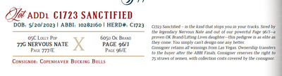 C1723 Sanctified – is the kind that stops you in your tracks. Sired by the legendary Nervous Nate and out of our powerful Page 96/J—a proven OK Brand/Lifting Lives daughter—this pedigree is as elite as they come. You simply can’t design one any better. Consigner retains all winnings from Las Vegas. Ownership transfers to the buyer after the ABBI Finals. Consigner reserves the right to 75 straws of semen, with collection costs covered by the consignor.