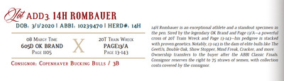 14H Rombauer is an exceptional athlete and a standout specimen in the pen. Sired by the legendary OK Brand and Page 13/A—a powerful cross of 20T Train Wreck and Page 13-143—his pedigree is stacked with proven genetics. Notably, 13-143 is the dam of elite bulls like The GeetUs, Double Oak, Show Stopper, Mind Freak, Cracker, and more. Ownership transfers to the buyer after the ABBI Classic Finals. Consignor reserves the right to 75 straws of semen, with collection costs covered by the consignor.