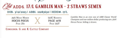 Gamblin Man is an own son of ABBI Classic World Champion and one million dollar producing sire, 561H Hocus Pocus. Selling 2 straws.