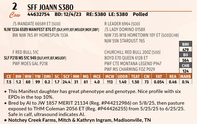 Bred by AI to JW 1857 MERIT 21134 (Reg. #P44212986) on 5/8/25, then pasture exposed to THM Coleman 2056 ET (