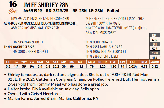 325L, the 2025 Cattleman Congress Champion Polled Hereford Bull. Her mother is a