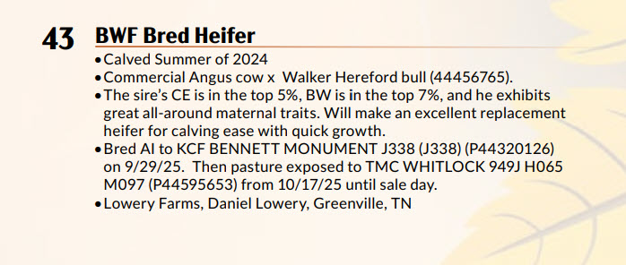Bred AI to KCF BENNETT MONUMENT J338 (J338) (P44320126) on 9/29/25. Then pasture exposed to TMC WHITLOCK 949J H065 M097 (P44595653) from 10/17/25 until sale day. Lowery Farms, Daniel Lowery, Greenville, TN