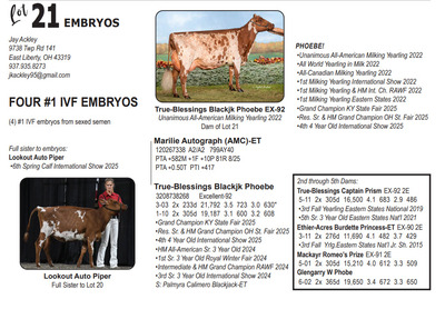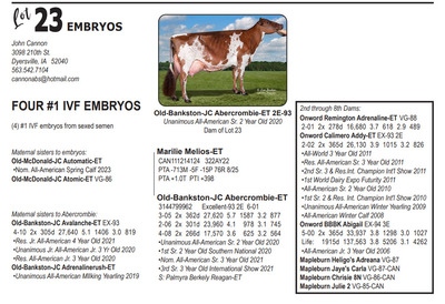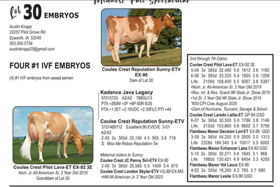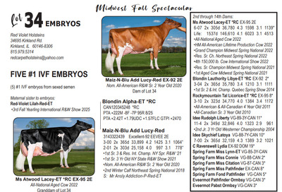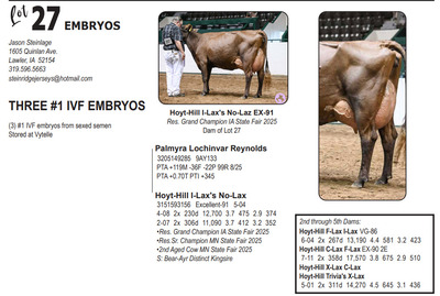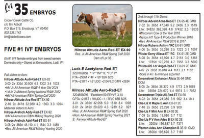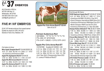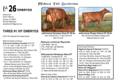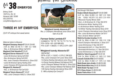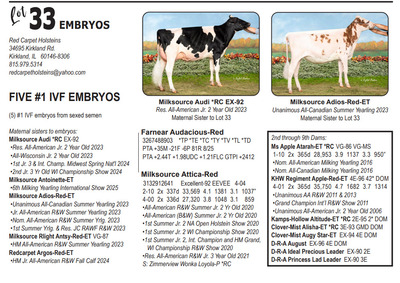 Midwest FALL Edition Sale at Do-N-Joy Genetics 40917 296TH ST , Arlington MN, 55307 Live lots - IVF Sessions - Embryos - Elite Choices Contact Agent: Catalog | Terms of Auction Download CATALOG Download UPDATES Catalog | Terms Download CATALOG Download UPDATES All Items (57) Cattle (24) Embryos (33) Categories All Items (57) Cattle (24) Embryos (33) Search Item #: Keyword: Search Catalog Item #: Keyword: 20 items per page 50 items per page 100 items per page Go to page #: 1 , 2 #21 – AUTOGRAPH X PHOEBE EMBRYOS (4) #1 IVF embryos from sexed semen Location: 40917 296TH ST , Arlington MN, 55307 More Info / Bid Now Track this Item Sold High Bid: $500.00 – #1027 Auction Type: Quantity x Price Quantity: 4 #21 – AUTOGRAPH X PHOEBE EMBRYOS Quantity x PriceQuantity: 4 Sold High Bid: $500 More Details More Info / Bid Track Item (4) #1 IVF embryos from sexed semen Location: 40917 296TH ST , Arlington MN, 55307 #22 – MAS X TIKIBAR EMBRYOS (4) #1 IVF embryos by mutually agreeable sire Location: 40917 296TH ST , Arlington MN, 55307 More Info / Bid Now Track this Item Sold High Bid: $400.00 – #1013 Auction Type: Quantity x Price Quantity: 4 #22 – MAS X TIKIBAR EMBRYOS Quantity x PriceQuantity: 4 Sold High Bid: $400 More Details More Info / Bid Track Item (4) #1 IVF embryos by mutually agreeable sire Location: 40917 296TH ST , Arlington MN, 55307 #23 – MELIOS X ABERCROMBIE EMBRYOS (4) #1 IVF embryos from sexed semen Location: 40917 296TH ST , Arlington MN, 55307 More Info / Bid Now Track this Item Sold High Bid: $475.00 – #1009 Auction Type: Quantity x Price Quantity: 4 #23 – MELIOS X ABERCROMBIE EMBRYOS Quantity x PriceQuantity: 4 Sold High Bid: $475 More Details More Info / Bid Track Item (4) #1 IVF embryos from sexed semen Location: 40917 296TH ST , Arlington MN, 55307 #24 – REAGAN X PIPER EMBRYOS (3) #1 IVF embryos from sexed semen Stored at Trans Ova Location: 40917 296TH ST , Arlington MN, 55307 More Info / Bid Now Track this Item Sold High Bid: $400.00 – #1008 Auction Type: Quantity x Price Quantity: 3 #24 – REAGAN X PIPER EMBRYOS Quantity x PriceQuantity: 3 Sold High Bid: $400 More Details More Info / Bid Track Item (3) #1 IVF embryos from sexed semen Stored at Trans Ova Location: 40917 296TH ST , Arlington MN, 55307 #25 – AUTOGRAPH X WYNNOW EMBRYOS (5) #1 IVF embryos from sexed semen Location: 40917 296TH ST , Arlington MN, 55307 More Info / Bid Now Track this Item Sold High Bid: $425.00 – #500 Auction Type: Quantity x Price Quantity: 5 #25 – AUTOGRAPH X WYNNOW EMBRYOS Quantity x PriceQuantity: 5 Sold High Bid: $425 More Details More Info / Bid Track Item (5) #1 IVF embryos from sexed semen Location: 40917 296TH ST , Arlington MN, 55307 #26 – REYNOLDS X ALISE EMBRYOS (3) #1 IVF embryos from sexed semen Location: 40917 296TH ST , Arlington MN, 55307 More Info / Bid Now Track this Item Sold High Bid: $375.00 – #1066 Auction Type: Quantity x Price Quantity: 3 #26 – REYNOLDS X ALISE EMBRYOS Quantity x PriceQuantity: 3 Sold High Bid: $375 More Details More Info / Bid Track Item (3) #1 IVF embryos from sexed semen Location: 40917 296TH ST , Arlington MN, 55307 #27 – REYNOLDS X NO LAX EMBRYOS (3) #1 IVF embryos from sexed semen Stored at Vytelle Location: 40917 296TH ST , Arlington MN, 55307 More Info / Bid Now Track this Item Sold High Bid: $325.00 – #1050 Auction Type: Quantity x Price Quantity: 3 #27 – REYNOLDS X NO LAX EMBRYOS Quantity x PriceQuantity: 3 Sold High Bid: $325 More Details More Info / Bid Track Item (3) #1 IVF embryos from sexed semen Stored at Vytelle Location: 40917 296TH ST , Arlington MN, 55307 #28 – RAY X WELCOME EMBRYOS (5) #1 IVF embryos from sexed semen Location: 40917 296TH ST , Arlington MN, 55307 More Info / Bid Now Track this Item Sold High Bid: $1,025.00 – #500 Auction Type: Quantity x Price Quantity: 5 #28 – RAY X WELCOME EMBRYOS Quantity x PriceQuantity: 5 Sold High Bid: $1,025 More Details More Info / Bid Track Item (5) #1 IVF embryos from sexed semen Location: 40917 296TH ST , Arlington MN, 55307 #29 – TIMEOUT X RUBY EMBRYOS (5) #1 IVF embryos from sexed semen Location: 40917 296TH ST , Arlington MN, 55307 More Info / Bid Now Track this Item Sold High Bid: $325.00 – #500 Auction Type: Quantity x Price Quantity: 5 #29 – TIMEOUT X RUBY EMBRYOS Quantity x PriceQuantity: 5 Sold High Bid: $325 More Details More Info / Bid Track Item (5) #1 IVF embryos from sexed semen Location: 40917 296TH ST , Arlington MN, 55307 #30 – LEGACY X SUNNY EMBRYOS (4) #1 IVF embryos from sexed semen Location: 40917 296TH ST , Arlington MN, 55307 More Info / Bid Now Track this Item Sold High Bid: $375.00 – #500 Auction Type: Quantity x Price Quantity: 4 #30 – LEGACY X SUNNY EMBRYOS Quantity x PriceQuantity: 4 Sold High Bid: $375 More Details More Info / Bid Track Item (4) #1 IVF embryos from sexed semen Location: 40917 296TH ST , Arlington MN, 55307 #32 – DICE & LAMBDA X TORRENT RED EMBRYOS (4) #1 IVF embryos from sexed semen Location: 40917 296TH ST , Arlington MN, 55307 More Info / Bid Now Track this Item Sold High Bid: $725.00 – #1025 Auction Type: Quantity x Price Quantity: 4 #32 – DICE & LAMBDA X TORRENT RED EMBRYOS Quantity x PriceQuantity: 4 Sold High Bid: $725 More Details More Info / Bid Track Item (4) #1 IVF embryos from sexed semen Location: 40917 296TH ST , Arlington MN, 55307 #33 – AUDACIOUS X ATTICA RED EMBRYOS (5) #1 IVF embryos from sexed semen Location: 40917 296TH ST , Arlington MN, 55307 More Info / Bid Now Track this Item Sold High Bid: $425.00 – #1109 Auction Type: Quantity x Price Quantity: 5 #33 – AUDACIOUS X ATTICA RED EMBRYOS Quantity x PriceQuantity: 5 Sold High Bid: $425 More Details More Info / Bid Track Item (5) #1 IVF embryos from sexed semen Location: 40917 296TH ST , Arlington MN, 55307 #34 – ALPHA X LUCY RED EMBRYOS (5) #1 IVF embryos from sexed semen Location: 40917 296TH ST , Arlington MN, 55307 More Info / Bid Now Track this Item Sold High Bid: $400.00 – #1109 Auction Type: Quantity x