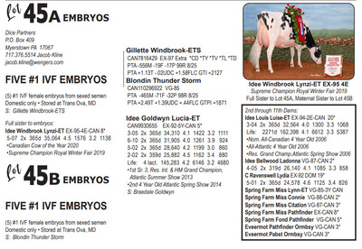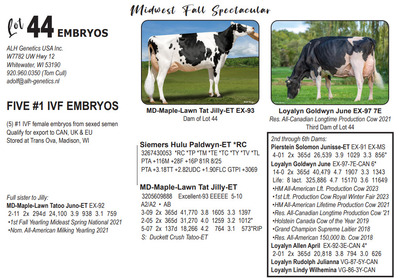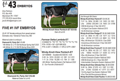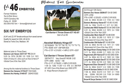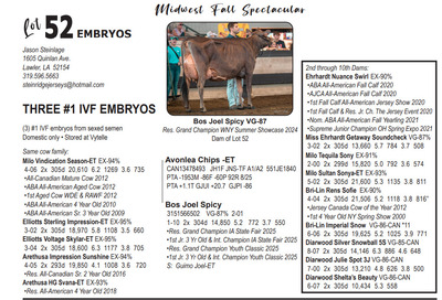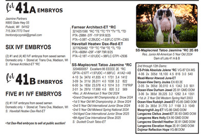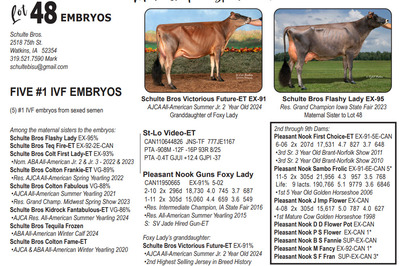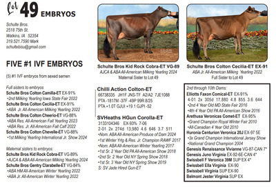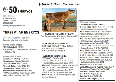 Midwest FALL Edition Sale at Do-N-Joy Genetics 40917 296TH ST , Arlington MN, 55307 Live lots - IVF Sessions - Embryos - Elite Choices Contact Agent: Catalog | Terms of Auction Download CATALOG Download UPDATES Catalog | Terms Download CATALOG Download UPDATES All Items (57) Cattle (24) Embryos (33) Categories All Items (57) Cattle (24) Embryos (33) Search Item #: Keyword: Search Catalog Item #: Keyword: 20 items per page 50 items per page 100 items per page Go to page #: 1 , 2 , 3 #41A – ARCHITECT X JASMIME EMBRYOS (2) #1 and (4) #2 IVF embryos from sexed semen Domestic only Stored at: Trans Ova, Madison, WI S: Farnear Architect-ET *RC Location: 40917 296TH ST , Arlington MN, 55307 More Info / Bid Now Track this Item Sold High Bid: $425.00 – #500 Auction Type: Quantity x Price Quantity: 6 #41A – ARCHITECT X JASMIME EMBRYOS Quantity x PriceQuantity: 6 Sold High Bid: $425 More Details More Info / Bid Track Item (2) #1 and (4) #2 IVF embryos from sexed semen Domestic only Stored at: Trans Ova, Madison, WI S: Farnear Architect-ET *RC Location: 40917 296TH ST , Arlington MN, 55307 #41B – DAX X JASMINE EMBRYOS (5) #1 IVF embryos from sexed semen Domestic only Stored at: Trans Ova, Madison, WI S: Haveitall Heatwv Dax-Red-ET 1st Dax-Red embryos to sell at public auction! Location: 40917 296TH ST , Arlington MN, 55307 More Info / Bid Now Track this Item Sold High Bid: $650.00 – #500 Auction Type: Quantity x Price Quantity: 5 #41B – DAX X JASMINE EMBRYOS Quantity x PriceQuantity: 5 Sold High Bid: $650 More Details More Info / Bid Track Item (5) #1 IVF embryos from sexed semen Domestic only Stored at: Trans Ova, Madison, WI S: Haveitall Heatwv Dax-Red-ET 1st Dax-Red embryos to sell at public auction! Location: 40917 296TH ST , Arlington MN, 55307 #42 – SHEEPSTER X DL ON THE YODER EMBRYOS (5) #1 IVF female embryos from sexed semen Qualify for export to CAN, UK & EU Stored at Trans Ova, Madison, WI Location: 40917 296TH ST , Arlington MN, 55307 More Info / Bid Now Track this Item Sold High Bid: $425.00 – #1140 Auction Type: Quantity x Price Quantity: 5 #42 – SHEEPSTER X DL ON THE YODER EMBRYOS Quantity x PriceQuantity: 5 Sold High Bid: $425 More Details More Info / Bid Track Item (5) #1 IVF female embryos from sexed semen Qualify for export to CAN, UK & EU Stored at Trans Ova, Madison, WI Location: 40917 296TH ST , Arlington MN, 55307 #43 – DELTA LAMBDA X PANTECH EMBRYOS (5) #1 IVF female embryos from sexed semen Domestic only Stored at Trans Ova, MD Location: 40917 296TH ST , Arlington MN, 55307 More Info / Bid Now Track this Item Sold High Bid: $375.00 – #1108 Auction Type: Quantity x Price Quantity: 5 #43 – DELTA LAMBDA X PANTECH EMBRYOS Quantity x PriceQuantity: 5 Sold High Bid: $375 More Details More Info / Bid Track Item (5) #1 IVF female embryos from sexed semen Domestic only Stored at Trans Ova, MD Location: 40917 296TH ST , Arlington MN, 55307 #44 – PALDWYN X JILLY EMBRYOS (5) #1 IVF female embryos from sexed semen Qualify for export to CAN, UK & EU Stored at Trans Ova, Madison, WI Location: 40917 296TH ST , Arlington MN, 55307 More Info / Bid Now Track this Item Sold High Bid: $450.00 – #1037 Auction Type: Quantity x Price Quantity: 5 #44 – PALDWYN X JILLY EMBRYOS Quantity x PriceQuantity: 5 Sold High Bid: $450 More Details More Info / Bid Track Item (5) #1 IVF female embryos from sexed semen Qualify for export to CAN, UK & EU Stored at Trans Ova, Madison, WI Location: 40917 296TH ST , Arlington MN, 55307 #45A – WINDBROOK X LUCIA EMBRYOS (5) #1 IVF female embryos from sexed semen Domestic only Stored at Trans Ova, MD S: Gillette Windbrook-ETS Location: 40917 296TH ST , Arlington MN, 55307 More Info / Bid Now Track this Item Sold High Bid: $375.00 – #500 Auction Type: Quantity x Price Quantity: 5 #45A – WINDBROOK X LUCIA EMBRYOS Quantity x PriceQuantity: 5 Sold High Bid: $375 More Details More Info / Bid Track Item (5) #1 IVF female embryos from sexed semen Domestic only Stored at Trans Ova, MD S: Gillette Windbrook-ETS Location: 40917 296TH ST , Arlington MN, 55307 #45B – THUNDERSTORM X LUCIA EMBRYOS (5) #1 IVF female embryos from sexed semen Domestic only Stored at Trans Ova, MD S: Blondin Thunder Storm Location: 40917 296TH ST , Arlington MN, 55307 More Info / Bid Now Track this Item Sold High Bid: $350.00 – #1079 Auction Type: Quantity x Price Quantity: 5 #45B – THUNDERSTORM X LUCIA EMBRYOS Quantity x PriceQuantity: 5 Sold High Bid: $350 More Details More Info / Bid Track Item (5) #1 IVF female embryos from sexed semen Domestic only Stored at Trans Ova, MD S: Blondin Thunder Storm Location: 40917 296TH ST , Arlington MN, 55307 #46 – HINGE X THROW DOWN EMBRYOS (4) #1 and (2) IVF female embryos from sexed semen Qualify for export to CAN, UK & EU Stored at Trans Ova, Madison, WI Location: 40917 296TH ST , Arlington MN, 55307 More Info / Bid Now Track this Item Sold High Bid: $625.00 – #500 Auction Type: Quantity x Price Quantity: 6 #46 – HINGE X THROW DOWN EMBRYOS Quantity x PriceQuantity: 6 Sold High Bid: $625 More Details More Info / Bid Track Item (4) #1 and (2) IVF female embryos from sexed semen Qualify for export to CAN, UK & EU Stored at Trans Ova, Madison, WI Location: 40917 296TH ST , Arlington MN, 55307 #47 – COLTON X FELICIDAD EMBRYOS (5) #1 IVF embryos from sexed semen Location: 40917 296TH ST , Arlington MN, 55307 More Info / Bid Now Track this Item Sold High Bid: $475.00 – #1067 Auction Type: Quantity x Price Quantity: 5 #47 – COLTON X FELICIDAD EMBRYOS Quantity x PriceQuantity: 5 Sold High Bid: $475 More Details More Info / Bid Track Item (5) #1 IVF embryos from sexed semen Location: 40917 296TH ST , Arlington MN, 55307 #48 – VIDEO X FOXY LADY EMBRYOS (5) #1 IVF embryos from sexed semen Location: 40917 296TH ST , Arlington MN, 55307 More Info / Bid Now Track this Item Sold High Bid: $500.00 – #1123 Auction Type: Quantity x Price Quantity: 5 #48 – VIDEO X FOXY LADY EMBRYOS Quantity x PriceQuantity: 5 Sold High Bid: $