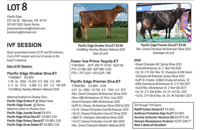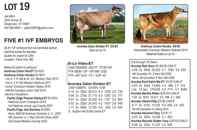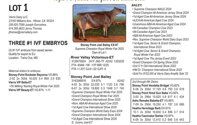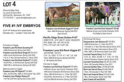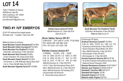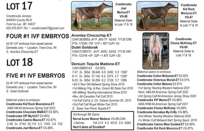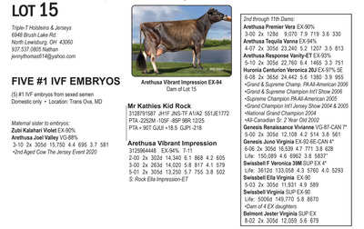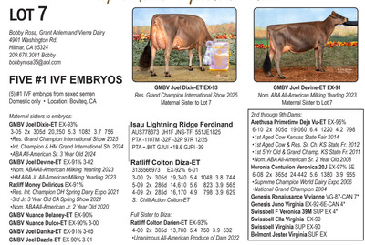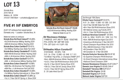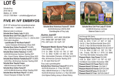 -Selling price is per Embryo or straw of semen Lots will be Sold with Reserves -Buyer is responsible for all costs of shipping expenses. This auction will utilize an auto-extend, race horse style soft closing. With this feature, the bidding will close on ALL lots at the same time. Bidding will start to close at 7:00 pm EST if any lot receives a bid in the last minute of bidding, ALL LOTS will extend bidding for an additional (ONE) 1 minute. Once 1 minute has lapsed without any bidding activity, then ALL lots will close.