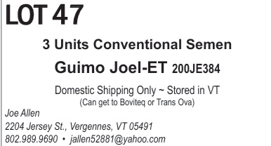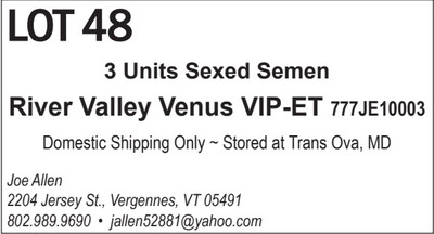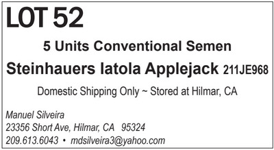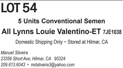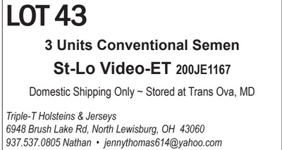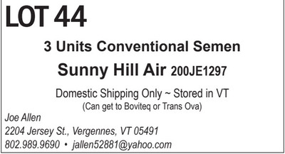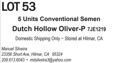 -Selling price is per Embryo or straw of semen Lots will be Sold with Reserves -Buyer is responsible for all costs of shipping expenses. This auction will utilize an auto-extend, race horse style soft closing. With this feature, the bidding will close on ALL lots at the same time. Bidding will start to close at 7:00 pm EST if any lot receives a bid in the last minute of bidding, ALL LOTS will extend bidding for an additional (ONE) 1 minute. Once 1 minute has lapsed without any bidding activity, then ALL lots will close.