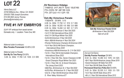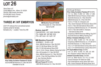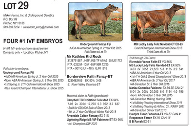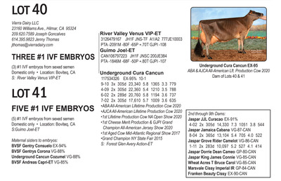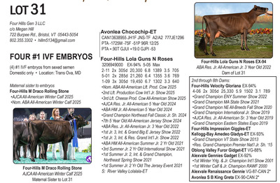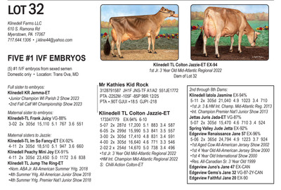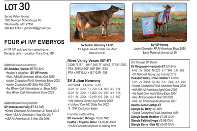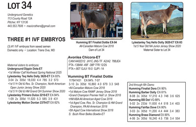 -Selling price is per Embryo or straw of semen Lots will be Sold with Reserves -Buyer is responsible for all costs of shipping expenses. This auction will utilize an auto-extend, race horse style soft closing. With this feature, the bidding will close on ALL lots at the same time. Bidding will start to close at 7:00 pm EST if any lot receives a bid in the last minute of bidding, ALL LOTS will extend bidding for an additional (ONE) 1 minute. Once 1 minute has lapsed without any bidding activity, then ALL lots will close.
