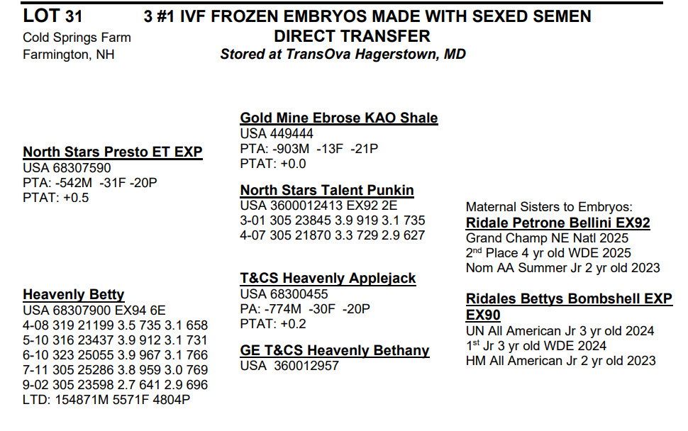 -Selling price is per Embryo or Straw of semen unless otherwise stated