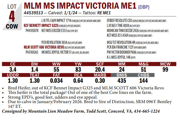 44539513 — Calved: 1/1/24 — Tattoo: RE ME1 Bred Heifer, out of KCF Bennet Impact G325 and MLM SCOTT 606 Victoria Revo This heifer is the total package! Out of one of the best Cow lines on the farm. Strong EPD’s, good feet, udders and eye appeal. Due to calve in January/February 2026. Bred to Sire of Distinction, SRM 096Y Bentley