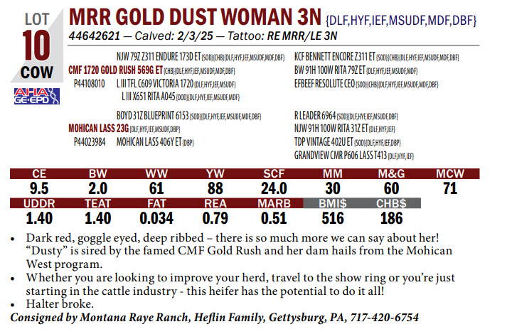 “Dusty” is sired by the famed CMF Gold Rush and her dam hails from the Mohican