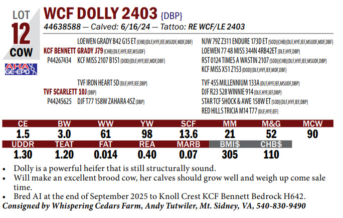 44638588 — Calved: 6/16/24 — Tattoo: RE WCF/LE 2403 Dolly is a powerful heifer that is still structurally sound.