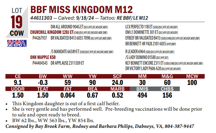 44611303 — Calved: 9/18/24 — Tattoo: RE BBF/LE M12 This Kingdom daughter is out of a first calf heifer.