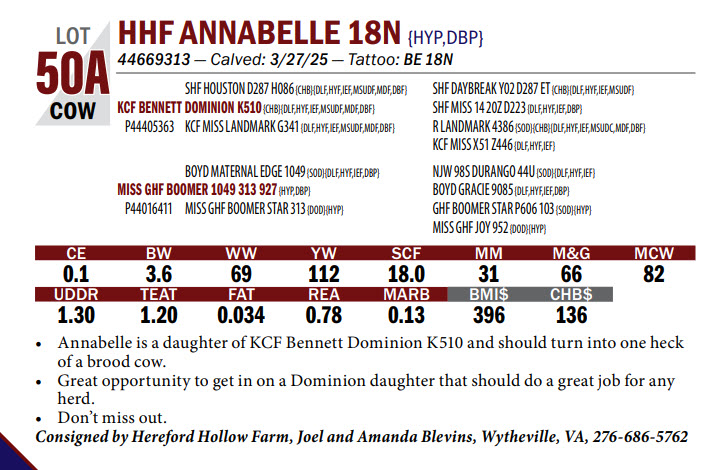 44669313 — Calved: 3/27/25 — Tattoo: BE 18N Annabelle is a daughter of KCF Bennett Dominion K510 and should turn into one heck
