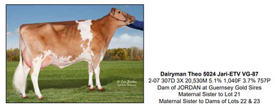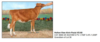 Born: 08-17-2021 Tag # 5036 Consignor: HOARDS DAIRYMAN FARM FORT ATKINSON WI 920-728-4822 DHI Herd # 35280016 Cow Control 005036 08/25 USDA GPTA -358M +0.28% +31F +0.03% -7P +4.1DPR +3.0PL +384NM$ 96NM%ile +390CM$ 68% Rel 2.94SCS 2.10HCR 32% Rel 5.90CCR 41% Rel 2.60LIV 31% Rel -0.40GL 43% Rel 4.70EFC 32% Rel 2 Rec YDev: -576M +46F -21P 4 App 08/25 PTAT +0.1 +0.7UDR -0.4FLC 74%Rel CPI +58 Appraisal: VG 85 @ 3-08 (VV++V) 1-11 264D 3X 11860M 5.2% 615F 3.6% 428P 103 2-10 304D 3X 16850M 5.7% 967F 3.6% 600P 104 3-10 305D 3X 20529M 4.9% 1009F 3.4% 706P Proj. Act. Health testing: negative for TB, Brucellosis & BVD #102(T) CPI Cow August 2025! Bred 9/28/25 to: Dairyman Audrey Optimus-ET 6GU140 840003240506927 A2A2 Last fresh 7/2/25 (3rd lactation)
