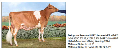 Born: 01-29-2024 Tag # 5550 Consignor: HOARDS DAIRYMAN FARM FORT ATKINSON WI 920-728-4822 08/25 USDA GPTA +234M -0.04% +4F +0.01% +9P +2.4DPR +3.1PL +243NM$ 85NM%ile +245CM$ 56% Rel 3.02SCS 2.20HCR 31% Rel 3.30CCR 35% Rel 2.00LIV 29% Rel 0.00GL 42% Rel 1.10EFC 31% Rel 0 App 08/25 PTAT -0.3 +0.3UDR -0.4FLC 58%Rel CPI +38 Health testing: negative for TB, Brucellosis & BVD Bred 3/30/25 Due 1/6/26 to: Dairyman Tsunami Jethro 514GU134 840003240506907 A2A2 SEXED