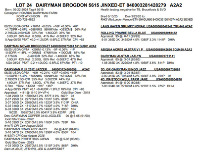 Born: 05-22-2024 Tag # 5614 Consignor: HOARDS DAIRYMAN FARM FORT ATKINSON WI 920-728-4822 08/25 USDA GPTA +392M +0.04% +25F +0.00% +13P -1.1DPR +2.5PL +305NM$ 91NM%ile +306CM$ 53% Rel 3.05SCS-0.30HCR 27% Rel -0.80CCR 29% Rel 0.20LIV 26% Rel 0.90GL 30% Rel 2.10EFC 26% Rel 0 App 08/25 PTAT +1.1 +0.6UDR +0.3FLC 56%Rel CPI +49 Health testing: negative for TB, Brucellosis & BVD Bred 6/1/25 Due 3/10/26 to: Dairyman Craig Jrue 514GU125 840003219111142 A2A2 SEXED