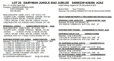 Born: 02-29-2024 Tag # 5564 Consignor: HOARDS DAIRYMAN FARM FORT ATKINSON WI 920-728-4822 08/25 USDA GPTA +60M +0.09% +19F +0.01% +3P +0.2DPR +1.3PL +96NM$ 59NM%ile +97CM$ 54% Rel 2.99SCS-0.20HCR 30% Rel 0.40CCR 33% Rel 0.20LIV 26% Rel 1.10GL 42% Rel 1.50EFC 29% Rel 0 App 08/25 PTAT +0.5 +0.9UDR +0.4FLC 57%Rel CPI +42 Health testing: negative for TB, Brucellosis & BVD BB Kappa Casein! Bred 4/11/25 Due 1/18/26 to: Dairyman Novak Pride 551GU902 840003009973827 A2A2 SEXED