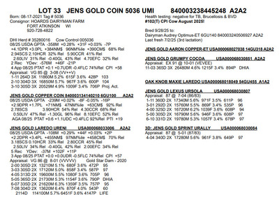Born: 07-09-2024 Tag # 5635 Consignor: HOARDS DAIRYMAN FARM FORT ATKINSON WI 920-728-4822 08/25 USDA GPTA -80M +0.12% +16F +0.00% -2P +1.8DPR +3.3PL +284NM$ 89NM%ile +286CM$ 52% Rel 2.91SCS 1.50HCR 29% Rel 2.60CCR 31% Rel 2.30LIV 27% Rel 0.30GL 31% Rel 2.30EFC 27% Rel 0 App 08/25 PTAT +0.7 +1.3UDR +0.5FLC 53%Rel CPI +56 Health testing: negative for TB, Brucellosis & BVD #194(T) CPI Heifer August 2025 Bred 8/17/25 Due 5/26/26 to: Dairyman Audrey Othello-ET 551GU918 840003240506930 A2A2 SEXED