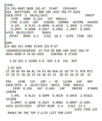 BORN 10/04/2024 P9 PJA 98 BBR 100 FEMALE EFI 7.2% AMERICAN ID 727/727 JH1F JNS-TF BRED: 08/27/2025 DUE: 06/02/2026 TO JX DUPAT CLEVER ELDERBROOK {6}-ET PJA98 14JE2370 JE840003242639378 BBR 100 JH1F JNS-TF A2A2 CDCB GPTA S 08/01/2025 0%RIP 75%R 649M 0.00% 33F 88%ILE 75%R -0.01% 22P 451CM$ 444NM$ 430FM$ 433GM$ 4.1PL 1.4LIV 1.8DPR 2.3CCR 1.2HCR 2.82SCS 0.1MFV 0.0DAB -0.3KET 0.9MAS 0.6MET -0.2RPL AJCA 08/01/2025 0DAUS GPTAT 78%R 0.3 GJUI 14.7 GJPI 73%R 168 RANKS ON THE TOP GJPI HEIFER LIST BRED USING SEXED SEMEN RANKS AMONG THE TOP 500 GJPI FEMALES IN THE BREED DONOR DAM