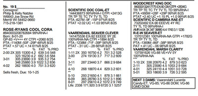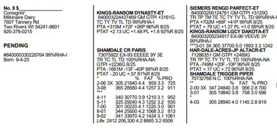 The BARRON FALL SALE 2025 120 N. 3rd Street, Barron WI, 54812 Great offering of genetics... Contact Agent: Aaron Ray Tompkins 336-363-4639 Catalog | Terms of Auction Download CATALOG Download ADDED LOTS PAGE 1 Download ADDED LOTS PAGE 2 Download ADDED LOTS PAGE 3 Catalog | Terms Download CATALOG Download ADDED LOTS PAGE 1 Download ADDED LOTS PAGE 2 Download ADDED LOTS PAGE 3 All Items (132) Cattle (102) Embryos (12) Semen (18) Categories All Items (132) Cattle (102) Embryos (12) Semen (18) Search Item #: Keyword: Search Catalog Item #: Keyword: 20 items per page 50 items per page 100 items per page Go to page #: 1 , 2 , 3 , 4 , 5 , 6 #1 – ROYAL-VISTA FINLEY-ET #840003269104704 99%RHA-I TR TC TL TD GTPI +2021G 8/25 Born: 9-14-23 PTA +573M -57F -7P 82%R 8/25 PTAT +2.16 UC +.93 81%R 8/24 *** % FAT % PRO 85#/day 2.8%F 2.7%P Fresh: 8-2-25 Location: 120 N. 3rd Street, Barron WI, 54812 Contact Agent: Aaron Ray Tompkins 336-363-4639 More Info / Bid Now Track this Item Sold High Bid: $3,800.00 – #1021 #1 – ROYAL-VISTA FINLEY-ET Sold High Bid: $3,800 More Details More Info / Bid Track Item #840003269104704 99%RHA-I TR TC TL TD GTPI +2021G 8/25 Born: 9-14-23 PTA +573M -57F -7P 82%R 8/25 PTAT +2.16 UC +.93 81%R 8/24 *** % FAT % PRO 85#/day 2.8%F 2.7%P Fresh: 8-2-25 Location: 120 N. 3rd Street, Barron WI, 54812 Contact Agent: Aaron Ray Tompkins 336-363-4639 #2 – DUCKETT CHILL FROSTY #840003144909666 99%RHA-I Born: 3-01-18 EX-93 EEVEE 6Y 2E CTPI +1918 8/25 PTA -774M -70F -35P 49%R 8/25 PTAT +1.47 UC +.96 45%R 8/25 *** % FAT % PRO 2-06 2X 305 23220 3.5 813 3.2 738 341 25520 3.4 880 3.2 813 3-09 191 20510 2.6 540 2.9 595 Fresh: 7-30-25 Location: 120 N. 3rd Street, Barron WI, 54812 Contact Agent: Aaron Ray Tompkins 336-363-4639 More Info / Bid Now Track this Item Sold High Bid: $3,000.00 – #1043 #2 – DUCKETT CHILL FROSTY Sold High Bid: $3,000 More Details More Info / Bid Track Item #840003144909666 99%RHA-I Born: 3-01-18 EX-93 EEVEE 6Y 2E CTPI +1918 8/25 PTA -774M -70F -35P 49%R 8/25 PTAT +1.47 UC +.96 45%R 8/25 *** % FAT % PRO 2-06 2X 305 23220 3.5 813 3.2 738 341 25520 3.4 880 3.2 813 3-09 191 20510 2.6 540 2.9 595 Fresh: 7-30-25 Location: 120 N. 3rd Street, Barron WI, 54812 Contact Agent: Aaron Ray Tompkins 336-363-4639 #3 – CRISDHOME ALT BERKLEY-ET #840003208399144 99%RHA-I RC TC TL TD GTP +2056G Born: 6-02-22 VG-85 VVVV+ 3Y GTPI +2056G 8/25 PTA -757M -36F -26P 84%R 8/25 PTAT +.91 UC +.35 84%R 8/25 *** % FAT % PRO 1-11 2X 330 21977 4.3 944 3.3 730 2-11 121 10568 4.2 447 3.1 326 (inc)” Last test: 94#/day 4.3%F 3.3%P SCC: 19 Fresh: May 2025. Will be bred to MB Lucklady Bullseye #840003234629819 (sexed) 1st place Summer Jr. 2Y District 1 ‘24 Location: 120 N. 3rd Street, Barron WI, 54812 Contact Agent: Aaron Ray Tompkins 336-363-4639 More Info / Bid Now Track this Item Sold High Bid: $5,000.00 – #79 #3 – CRISDHOME ALT BERKLEY-ET Sold High Bid: $5,000 More Details More Info / Bid Track Item #840003208399144 99%RHA-I RC TC TL TD GTP +2056G Born: 6-02-22 VG-85 VVVV+ 3Y GTPI +2056G 8/25 PTA -757M -36F -26P 84%R 8/25 PTAT +.91 UC +.35 84%R 8/25 *** % FAT % PRO 1-11 2X 330 21977 4.3 944 3.3 730 2-11 121 10568 4.2 447 3.1 326 (inc)” Last test: 94#/day 4.3%F 3.3%P SCC: 19 Fresh: May 2025. Will be bred to MB Lucklady Bullseye #840003234629819 (sexed) 1st place Summer Jr. 2Y District 1 ‘24 Location: 120 N. 3rd Street, Barron WI, 54812 Contact Agent: Aaron Ray Tompkins 336-363-4639 #4 – NOVA CRUSABULL MARBLE #840003270403745 99%RHA-I Born: 7-13-23 PTPI +2325 8/25 PTA -296M -37F -17P 34%R 8/25 PTAT +1.85 UC +1.26 35%R 8/25 Sells fresh, Due: 10-20-25 Location: 120 N. 3rd Street, Barron WI, 54812 Contact Agent: Aaron Ray Tompkins 336-363-4639 More Info / Bid Now Track this Item Sold High Bid: $3,600.00 – #79 #4 – NOVA CRUSABULL MARBLE Sold High Bid: $3,600 More Details More Info / Bid Track Item #840003270403745 99%RHA-I Born: 7-13-23 PTPI +2325 8/25 PTA -296M -37F -17P 34%R 8/25 PTAT +1.85 UC +1.26 35%R 8/25 Sells fresh, Due: 10-20-25 Location: 120 N. 3rd Street, Barron WI, 54812 Contact Agent: Aaron Ray Tompkins 336-363-4639 #5 – CRISDHOME UNX LIFEISGOOD-ET #840003208399229 99%RHA-I Born: 6-15-23 Not Classified PTPI +2249 8/25 PTA -308M -24F -18P 46%R 8/25 PTAT +1.58 UC +.94 46%R 8/25 *** % FAT % PRO 2-02 2X 47 3289 4.6 151 2.9 95 (inc)” Last test: 80#/day 4.4%F 3.0%P SCC 43" Fresh: 9-2-25 Location: 120 N. 3rd Street, Barron WI, 54812 Contact Agent: Aaron Ray Tompkins 336-363-4639 More Info / Bid Now Track this Item Sold High Bid: $5,250.00 – #79 #5 – CRISDHOME UNX LIFEISGOOD-ET Sold High Bid: $5,250 More Details More Info / Bid Track Item #840003208399229 99%RHA-I Born: 6-15-23 Not Classified PTPI +2249 8/25 PTA -308M -24F -18P 46%R 8/25 PTAT +1.58 UC +.94 46%R 8/25 *** % FAT % PRO 2-02 2X 47 3289 4.6 151 2.9 95 (inc)” Last test: 80#/day 4.4%F 3.0%P SCC 43" Fresh: 9-2-25 Location: 120 N. 3rd Street, Barron WI, 54812 Contact Agent: Aaron Ray Tompkins 336-363-4639 #5.5 – CRISDHOME TATOO LIVESAVER #840003208399364 Born: 9-2-25 Location: 120 N. 3rd Street, Barron WI, 54812 Contact Agent: Aaron Ray Tompkins 336-363-4639 More Info / Bid Now Track this Item Sold High Bid: $3,000.00 – #37 #5.5 – CRISDHOME TATOO LIVESAVER Sold High Bid: $3,000 More Details More Info / Bid Track Item #840003208399364 Born: 9-2-25 Location: 120 N. 3rd Street, Barron WI, 54812 Contact Agent: Aaron Ray Tompkins 336-363-4639 #6 – SKY-REACH AB APPLEROSE-RED #840003247015447 100%RHA-NA Born: 9-18-23 PTPI +1976 8/25 PTA -964M -34F -25P 35%R 8/25 PTAT +1.25 UC +.83 35%R 8/25 Sells fresh; Due: 10-25-25 Location: 120 N. 3rd Street, Barron WI, 54812 Contact Agent: Aaron Ray Tompkins 336-363-4639 More Info / Bid Now Track this Item Sold High Bid: $4,000.00 – #10 #6 – SKY-REACH AB APPLEROSE-RED Sold High Bid: $4,000 More Details More Info / Bid Track Item #840003247015447 100%RHA-NA Born: 9-18-23 PTPI +1976 8/25 PTA -964M -34F -25P 35%R 8/25 PTAT +1.25 UC +.83 35%R 8/25 Sells fresh; Due: 10-25-25 Loca