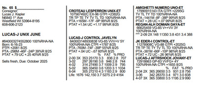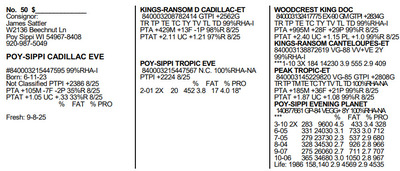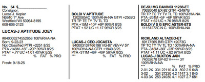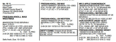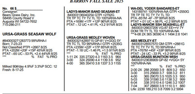 The BARRON FALL SALE 2025 120 N. 3rd Street, Barron WI, 54812 Great offering of genetics... Contact Agent: Aaron Ray Tompkins 336-363-4639 Catalog | Terms of Auction Download CATALOG Download ADDED LOTS PAGE 1 Download ADDED LOTS PAGE 2 Download ADDED LOTS PAGE 3 Catalog | Terms Download CATALOG Download ADDED LOTS PAGE 1 Download ADDED LOTS PAGE 2 Download ADDED LOTS PAGE 3 All Items (132) Cattle (102) Embryos (12) Semen (18) Categories All Items (132) Cattle (102) Embryos (12) Semen (18) Search Item #: Keyword: Search Catalog Item #: Keyword: 20 items per page 50 items per page 100 items per page Go to page #: 2 , 3 , 4 , 5 , 6 , 7 #50 – POY-SIPPI CADILLAC EVE #840003215447595 99%RHA-I Born: 6-11-23 Not Classified PTPI +2386 8/25 PTA +105M -7F -2P 35%R 8/25 PTAT +1.05 UC +.33 33%R 8/25 % FAT % PRO Fresh: 9-8-25 Location: 120 N. 3rd Street, Barron WI, 54812 Contact Agent: Aaron Ray Tompkins 336-363-4639 More Info / Bid Now Track this Item Sold High Bid: $3,250.00 – #1070 #50 – POY-SIPPI CADILLAC EVE Sold High Bid: $3,250 More Details More Info / Bid Track Item #840003215447595 99%RHA-I Born: 6-11-23 Not Classified PTPI +2386 8/25 PTA +105M -7F -2P 35%R 8/25 PTAT +1.05 UC +.33 33%R 8/25 % FAT % PRO Fresh: 9-8-25 Location: 120 N. 3rd Street, Barron WI, 54812 Contact Agent: Aaron Ray Tompkins 336-363-4639 #51 – POY-SIPPI KING ROYAL SW #840003215447592 99%RHA-I Born: 10-20-22 GP-83 ++++ 2Y PTPI +2200 8/25 PTA -638M -11F -13P 35%R 8/25 PTAT +.34 UC -.61 50%R 8/25 *** % FAT % PRO 2-06 2X 126 10281 4.5 460 3.2 324 (inc)” SCC: 31 Fresh: 4-23-25 Location: 120 N. 3rd Street, Barron WI, 54812 Contact Agent: Aaron Ray Tompkins 336-363-4639 More Info / Bid Now Track this Item Sold High Bid: $3,000.00 – #79 #51 – POY-SIPPI KING ROYAL SW Sold High Bid: $3,000 More Details More Info / Bid Track Item #840003215447592 99%RHA-I Born: 10-20-22 GP-83 ++++ 2Y PTPI +2200 8/25 PTA -638M -11F -13P 35%R 8/25 PTAT +.34 UC -.61 50%R 8/25 *** % FAT % PRO 2-06 2X 126 10281 4.5 460 3.2 324 (inc)” SCC: 31 Fresh: 4-23-25 Location: 120 N. 3rd Street, Barron WI, 54812 Contact Agent: Aaron Ray Tompkins 336-363-4639 #52 – POY-SIPPI EYECANDY MIDNIGHT #840003250031051 99%RHA-I Born: 10-19-23 Not Classified PTPI +2237 8/25 PTA -747M -29F -20P 34%R 8/25 PTAT +1.63 UC +.86 30%R 8/25 Fresh: 10-8-25 Location: 120 N. 3rd Street, Barron WI, 54812 Contact Agent: Aaron Ray Tompkins 336-363-4639 More Info / Bid Now Track this Item No Bids Starting at $1,500.00 Login to Bid #52 – POY-SIPPI EYECANDY MIDNIGHT Starting at $1,500.00 Login to Bid More Details More Info / Bid Track Item #840003250031051 99%RHA-I Born: 10-19-23 Not Classified PTPI +2237 8/25 PTA -747M -29F -20P 34%R 8/25 PTAT +1.63 UC +.86 30%R 8/25 Fresh: 10-8-25 Location: 120 N. 3rd Street, Barron WI, 54812 Contact Agent: Aaron Ray Tompkins 336-363-4639 #52.5 – POY-SIPPI EC MIDNIGHT PENDING Born: 10-8-25 Location: 120 N. 3rd Street, Barron WI, 54812 Contact Agent: Aaron Ray Tompkins 336-363-4639 More Info / Bid Now Track this Item Sold High Bid: $1,750.00 – #88 #52.5 – POY-SIPPI EC MIDNIGHT Sold High Bid: $1,750 More Details More Info / Bid Track Item PENDING Born: 10-8-25 Location: 120 N. 3rd Street, Barron WI, 54812 Contact Agent: Aaron Ray Tompkins 336-363-4639 #53 – MILKINAIRE ALT AIR ONE-RED #840003288240847 99%RHA-I Born: 11-01-24 GTPI +2151G 8/25 PTA -994M -37F -30P 81%R 8/25 PTAT +2.55 UC +1.57 81%R 8/25 Location: 120 N. 3rd Street, Barron WI, 54812 Contact Agent: Aaron Ray Tompkins 336-363-4639 More Info / Bid Now Track this Item Sold High Bid: $2,300.00 – #28 #53 – MILKINAIRE ALT AIR ONE-RED Sold High Bid: $2,300 More Details More Info / Bid Track Item #840003288240847 99%RHA-I Born: 11-01-24 GTPI +2151G 8/25 PTA -994M -37F -30P 81%R 8/25 PTAT +2.55 UC +1.57 81%R 8/25 Location: 120 N. 3rd Street, Barron WI, 54812 Contact Agent: Aaron Ray Tompkins 336-363-4639 #54 – ALBE-MAK SELECT JUPITER #840003227138874 96%RHA-I Born: 3-01-23 Not Classified PTPI +2298 8/25 PTA -1069M -20F -24P 34%R 8/25 PTAT +1.89 UC +1.13 38%R 8/25 % FAT % PRO 2-04 2X 55 91#/day 3.7%F 2.7%P Fresh: 7-11-25 Bred: 9-25-25 to Trent-Way Hayk Hard Rock #840003261835778 Location: 120 N. 3rd Street, Barron WI, 54812 Contact Agent: Aaron Ray Tompkins 336-363-4639 More Info / Bid Now Track this Item Sold High Bid: $2,750.00 – #18 #54 – ALBE-MAK SELECT JUPITER Sold High Bid: $2,750 More Details More Info / Bid Track Item #840003227138874 96%RHA-I Born: 3-01-23 Not Classified PTPI +2298 8/25 PTA -1069M -20F -24P 34%R 8/25 PTAT +1.89 UC +1.13 38%R 8/25 % FAT % PRO 2-04 2X 55 91#/day 3.7%F 2.7%P Fresh: 7-11-25 Bred: 9-25-25 to Trent-Way Hayk Hard Rock #840003261835778 Location: 120 N. 3rd Street, Barron WI, 54812 Contact Agent: Aaron Ray Tompkins 336-363-4639 #55 – FRIESIAN-KNOLL MAX WESTMAX #840003238170165 99%RHA-I Born: 2-23-21 VG-87 VVEVV 4Y CTPI +2010 8/25 PTA -1236M -27F -28P 43%R 8/25 PTAT +1.18 UC +.04 51%R 8/25 *** % FAT % PRO 2-04 2X 305 14350 5.0 717 3.7 531 365 17180 5.0 865 3.7 633 Sells fresh, Due: 10-12-25 Location: 120 N. 3rd Street, Barron WI, 54812 Contact Agent: Aaron Ray Tompkins 336-363-4639 More Info / Bid Now Track this Item Sold High Bid: $3,500.00 – #25 #55 – FRIESIAN-KNOLL MAX WESTMAX Sold High Bid: $3,500 More Details More Info / Bid Track Item #840003238170165 99%RHA-I Born: 2-23-21 VG-87 VVEVV 4Y CTPI +2010 8/25 PTA -1236M -27F -28P 43%R 8/25 PTAT +1.18 UC +.04 51%R 8/25 *** % FAT % PRO 2-04 2X 305 14350 5.0 717 3.7 531 365 17180 5.0 865 3.7 633 Sells fresh, Due: 10-12-25 Location: 120 N. 3rd Street, Barron WI, 54812 Contact Agent: Aaron Ray Tompkins 336-363-4639 #56 – WELSH-EDGE GAMECHANGE RETRO #840003259989936 99%RHA-I Born: 10-08-23 Not Classified PTPI +2163 8/25 PTA -557M -28F -26P 34%R 8/25 PTAT +.94 UC +.46 34%R 8/25 *** % FAT % PRO Fresh: 9-6-25 Location: 120 N. 3rd Street, Barron WI, 54812 Contact Agent: Aaron Ray Tompkins 336-363-4639 More Info / Bid Now Track this Item Sold High Bid: $4,800.00 – #19 #56 – WELSH-EDGE GAM