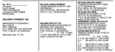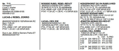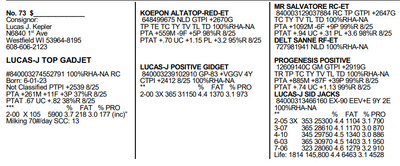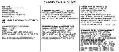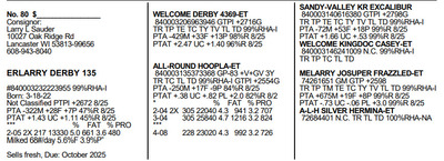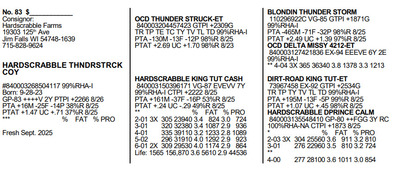 The BARRON FALL SALE 2025 120 N. 3rd Street, Barron WI, 54812 Great offering of genetics... Contact Agent: Aaron Ray Tompkins 336-363-4639 Catalog | Terms of Auction Download CATALOG Download ADDED LOTS PAGE 1 Download ADDED LOTS PAGE 2 Download ADDED LOTS PAGE 3 Catalog | Terms Download CATALOG Download ADDED LOTS PAGE 1 Download ADDED LOTS PAGE 2 Download ADDED LOTS PAGE 3 All Items (132) Cattle (102) Embryos (12) Semen (18) Categories All Items (132) Cattle (102) Embryos (12) Semen (18) Search Item #: Keyword: Search Catalog Item #: Keyword: 20 items per page 50 items per page 100 items per page Go to page #: 2 , 3 , 4 , 5 , 6 , 7 #69 – EZ-WITT BARB JIZZY JAZZY #840003218787430 99%RHA-I Born: 6-01-23 PTPI +2170 8/25 PTA -319M -51F -23P 37%R 8/25 PTAT +1.79 UC +1.49 38%R 8/25 Due: 11-2-25 Location: 120 N. 3rd Street, Barron WI, 54812 Contact Agent: Aaron Ray Tompkins 336-363-4639 More Info / Bid Now Track this Item No Bids Starting at $1,500.00 Login to Bid #69 – EZ-WITT BARB JIZZY JAZZY Starting at $1,500.00 Login to Bid More Details More Info / Bid Track Item #840003218787430 99%RHA-I Born: 6-01-23 PTPI +2170 8/25 PTA -319M -51F -23P 37%R 8/25 PTAT +1.79 UC +1.49 38%R 8/25 Due: 11-2-25 Location: 120 N. 3rd Street, Barron WI, 54812 Contact Agent: Aaron Ray Tompkins 336-363-4639 #70 – NAT-WAY EYE CANDY HONEST #840003266245362 99%RHA-I Born: 8-06-23 Not Classified PTPI +2418 8/25 PTA -540M -5F -14P 32%R 8/25 PTAT +2.22 UC +1.22 31%R 8/25 *** % FAT % PRO Fresh: 8-31-25 Location: 120 N. 3rd Street, Barron WI, 54812 Contact Agent: Aaron Ray Tompkins 336-363-4639 More Info / Bid Now Track this Item No Bids Starting at $1,500.00 Login to Bid #70 – NAT-WAY EYE CANDY HONEST Starting at $1,500.00 Login to Bid More Details More Info / Bid Track Item #840003266245362 99%RHA-I Born: 8-06-23 Not Classified PTPI +2418 8/25 PTA -540M -5F -14P 32%R 8/25 PTAT +2.22 UC +1.22 31%R 8/25 *** % FAT % PRO Fresh: 8-31-25 Location: 120 N. 3rd Street, Barron WI, 54812 Contact Agent: Aaron Ray Tompkins 336-363-4639 #71 – LUCAS-J REBEL ZORRO #840003274552818 100%RHA-NA RC Born: 7-25-23 PTPI +2541 PTA -206M +13F +4P 34%R 8/25 PTAT +.23 UC +.29 33%R 8/25 Due in Jan. 2026 to Siemers Parbo-ET #840003243347747 Location: 120 N. 3rd Street, Barron WI, 54812 Contact Agent: Aaron Ray Tompkins 336-363-4639 More Info / Bid Now Track this Item Sold High Bid: $3,400.00 – #54 #71 – LUCAS-J REBEL ZORRO Sold High Bid: $3,400 More Details More Info / Bid Track Item #840003274552818 100%RHA-NA RC Born: 7-25-23 PTPI +2541 PTA -206M +13F +4P 34%R 8/25 PTAT +.23 UC +.29 33%R 8/25 Due in Jan. 2026 to Siemers Parbo-ET #840003243347747 Location: 120 N. 3rd Street, Barron WI, 54812 Contact Agent: Aaron Ray Tompkins 336-363-4639 #72 – LUCAS-J VERN PERSEUS #840003274552833 100%RHA-NA RC Born: 8-16-23 Not Classified PTPI +2476 8/25 PTA -90M -8F +3P 18%R 8/25 PTAT +.84 UC +.47 18%R 8/25 *** % FAT % PRO Fresh: 8-20-25 Location: 120 N. 3rd Street, Barron WI, 54812 Contact Agent: Aaron Ray Tompkins 336-363-4639 More Info / Bid Now Track this Item Sold High Bid: $2,250.00 – #14 #72 – LUCAS-J VERN PERSEUS Sold High Bid: $2,250 More Details More Info / Bid Track Item #840003274552833 100%RHA-NA RC Born: 8-16-23 Not Classified PTPI +2476 8/25 PTA -90M -8F +3P 18%R 8/25 PTAT +.84 UC +.47 18%R 8/25 *** % FAT % PRO Fresh: 8-20-25 Location: 120 N. 3rd Street, Barron WI, 54812 Contact Agent: Aaron Ray Tompkins 336-363-4639 #73 – LUCAS-J TOP GADJET #840003274552791 100%RHA-NA RC Born: 6-01-23 Not Classified PTPI +2539 8/25 PTA +261M +11F +3P 37%R 8/25 PTAT .67 UC +.82 38%R 8/25 *** % FAT % PRO 2-00 X 105 5900 3.7 218 3.0 177 (inc)” Milking 70#/day SCC: 13 Location: 120 N. 3rd Street, Barron WI, 54812 Contact Agent: Aaron Ray Tompkins 336-363-4639 More Info / Bid Now Track this Item No Bids Starting at $1,500.00 Login to Bid #73 – LUCAS-J TOP GADJET Starting at $1,500.00 Login to Bid More Details More Info / Bid Track Item #840003274552791 100%RHA-NA RC Born: 6-01-23 Not Classified PTPI +2539 8/25 PTA +261M +11F +3P 37%R 8/25 PTAT .67 UC +.82 38%R 8/25 *** % FAT % PRO 2-00 X 105 5900 3.7 218 3.0 177 (inc)” Milking 70#/day SCC: 13 Location: 120 N. 3rd Street, Barron WI, 54812 Contact Agent: Aaron Ray Tompkins 336-363-4639 #74 – PENDING 99%RHA-I Born: 9-2-25 Location: 120 N. 3rd Street, Barron WI, 54812 Contact Agent: Aaron Ray Tompkins 336-363-4639 More Info / Bid Now Track this Item Sold High Bid: $2,500.00 – #23 #74 – PENDING Sold High Bid: $2,500 More Details More Info / Bid Track Item 99%RHA-I Born: 9-2-25 Location: 120 N. 3rd Street, Barron WI, 54812 Contact Agent: Aaron Ray Tompkins 336-363-4639 #75 – BREMER ZABRILA WHATSHE #840003224338935 99%RHA-I TR TC TL TD GTPI +2739G 8/25 Born: 7-10-21 GP-83 +VF+V 3Y PTA -567M +34F +13P 84%R 8/25 PTAT +.54 UC +1.31 84%R 8/25 *** % FAT % PRO 1-11 2X 305 18460 5.0 915 3.8 700 365 21520 5.0 1073 3.9 830 3-04 272 24450 4.4 1072 3.6 883 Sells fresh Location: 120 N. 3rd Street, Barron WI, 54812 Contact Agent: Aaron Ray Tompkins 336-363-4639 More Info / Bid Now Track this Item No Bids Starting at $1,500.00 Login to Bid #75 – BREMER ZABRILA WHATSHE Starting at $1,500.00 Login to Bid More Details More Info / Bid Track Item #840003224338935 99%RHA-I TR TC TL TD GTPI +2739G 8/25 Born: 7-10-21 GP-83 +VF+V 3Y PTA -567M +34F +13P 84%R 8/25 PTAT +.54 UC +1.31 84%R 8/25 *** % FAT % PRO 1-11 2X 305 18460 5.0 915 3.8 700 365 21520 5.0 1073 3.9 830 3-04 272 24450 4.4 1072 3.6 883 Sells fresh Location: 120 N. 3rd Street, Barron WI, 54812 Contact Agent: Aaron Ray Tompkins 336-363-4639 #76 – NAT-WAY COLLISION HAITI #840003266245367 99%RHA-I Born: 10-09-23 PTPI +2144 8/25 PTA -518M -36F -21P 35%R 8/25 PTAT +1.58 UC +1.42 37%R 8/25 Due: 12-15-25 to Jinx Location: 120 N. 3rd Street, Barron WI, 54812 Contact Agent: Aaron Ray Tompkins 336-363-4639 More Info / Bid Now Track this Item Sold High Bid: $2,900.00 – #47 #76 – NAT-WAY COLLISION HAITI Sold High Bid: $2,900 More Details More Info / Bid T