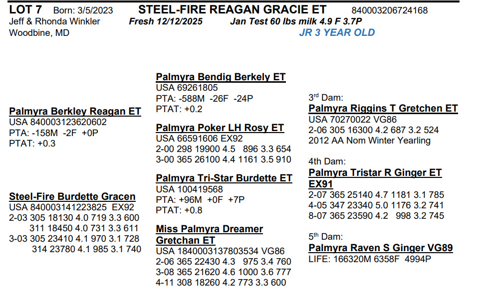 Born: 3/5/2023 Fresh 12/12/2025 Jan Test 60 lbs milk 4.9 F 3.7P