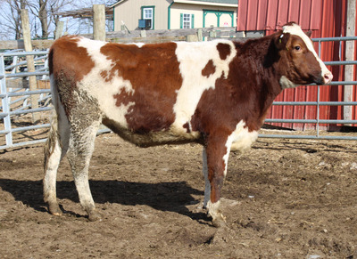 BREED:  HOL INFO:  MGS. REDO-RED REPRO:  PREG. 7 MO. TO BEEF BULL SIRE:  WA-DEL SHIMMER BARNETT DOB: 01/00/00