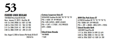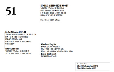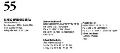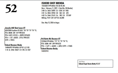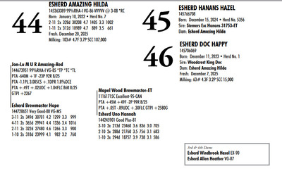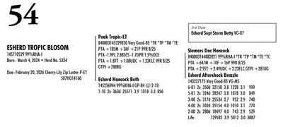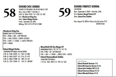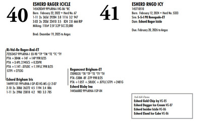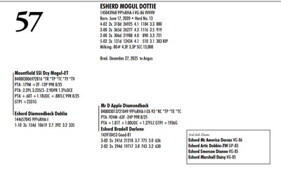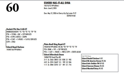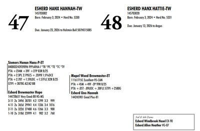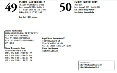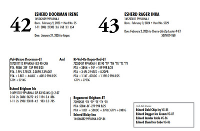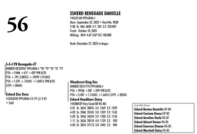 Esh Dairy Dispersal Auction 3736 E. Newport Rd, Gordonville PA, 17529 Esh Dairy Dispersal Auction Contact Agent: Katie 717-543-7883 Catalog | Terms of Auction Download SALE BILL Download CATALOG Download SALE ORDER AND UPDATES Catalog | Terms Download SALE BILL Download CATALOG Download SALE ORDER AND UPDATES All Items (109) Cattle (103) No Category (6) Categories All Items (109) Cattle (103) No Category (6) Search Item #: Keyword: Search Catalog Item #: Keyword: 20 items per page 50 items per page 100 items per page Go to page #: 1 , 2 , 3 , 4 , 5 , 6 #41 – ESHERD RNGD ICY 145710510 Born: February 12, 2024 Herd No. 5333 Sire: S-S-I PR Renegade-ET Dam: Esherd Rager Icicle Due: February 20, 2026 to Angus Location: 3736 E. Newport Rd, Gordonville PA, 17529 Contact Agent: Katie 717-543-7883 More Info / Bid Now Track this Item Sold High Bid: $4,000.00 – #50 #41 – ESHERD RNGD ICY Sold High Bid: $4,000 More Details More Info / Bid Track Item 145710510 Born: February 12, 2024 Herd No. 5333 Sire: S-S-I PR Renegade-ET Dam: Esherd Rager Icicle Due: February 20, 2026 to Angus Location: 3736 E. Newport Rd, Gordonville PA, 17529 Contact Agent: Katie 717-543-7883 #42 – ESHERD DOORMAN IRENE 145542609 99%RHA-I Born: February 9, 2023 Herd No. 35 1-11 308d 21383 3.6 768 3.1 654 Due: January 21, 2026 to Angus Location: 3736 E. Newport Rd, Gordonville PA, 17529 Contact Agent: Katie 717-543-7883 More Info / Bid Now Track this Item Sold High Bid: $3,900.00 – #201 #42 – ESHERD DOORMAN IRENE Sold High Bid: $3,900 More Details More Info / Bid Track Item 145542609 99%RHA-I Born: February 9, 2023 Herd No. 35 1-11 308d 21383 3.6 768 3.1 654 Due: January 21, 2026 to Angus Location: 3736 E. Newport Rd, Gordonville PA, 17529 Contact Agent: Katie 717-543-7883 #43 – ESHERD RAGER INKA 145703011 99%RHA-I Born: February 3, 2024 Herd No. 5329 Due: February 2, 2026 to Cherry-Lily Zip Luster-P-ET 507HO14160 Location: 3736 E. Newport Rd, Gordonville PA, 17529 Contact Agent: Katie 717-543-7883 More Info / Bid Now Track this Item Sold High Bid: $4,000.00 – #21 #43 – ESHERD RAGER INKA Sold High Bid: $4,000 More Details More Info / Bid Track Item 145703011 99%RHA-I Born: February 3, 2024 Herd No. 5329 Due: February 2, 2026 to Cherry-Lily Zip Luster-P-ET 507HO14160 Location: 3736 E. Newport Rd, Gordonville PA, 17529 Contact Agent: Katie 717-543-7883 #44 – ESHERD AMAZING HILDA 145363389 99%RHA-I VG-86 VVVVV @ 3-08 *RC Born: January 10, 2022 Herd No. 7 2-11 2x 328d 30208 4.7 1405 3.3 1002 1-11 2x 312d 18989 4.7 889 3.5 661 Fresh: December 20, 2025 Milking: 103# 4.7F 3.7P SCC 107,000 Location: 3736 E. Newport Rd, Gordonville PA, 17529 Contact Agent: Katie 717-543-7883 More Info / Bid Now Track this Item Sold High Bid: $4,000.00 – #227 #44 – ESHERD AMAZING HILDA Sold High Bid: $4,000 More Details More Info / Bid Track Item 145363389 99%RHA-I VG-86 VVVVV @ 3-08 *RC Born: January 10, 2022 Herd No. 7 2-11 2x 328d 30208 4.7 1405 3.3 1002 1-11 2x 312d 18989 4.7 889 3.5 661 Fresh: December 20, 2025 Milking: 103# 4.7F 3.7P SCC 107,000 Location: 3736 E. Newport Rd, Gordonville PA, 17529 Contact Agent: Katie 717-543-7883 #45 – ESHERD HANANS HAZEL 145766708 Born: December 15, 2024 Herd No. 5356 Sire: Siemers Exc Hanans 31753-ET Dam: Esherd Amazing Hilda Location: 3736 E. Newport Rd, Gordonville PA, 17529 Contact Agent: Katie 717-543-7883 More Info / Bid Now Track this Item Sold High Bid: $2,000.00 – #71 #45 – ESHERD HANANS HAZEL Sold High Bid: $2,000 More Details More Info / Bid Track Item 145766708 Born: December 15, 2024 Herd No. 5356 Sire: Siemers Exc Hanans 31753-ET Dam: Esherd Amazing Hilda Location: 3736 E. Newport Rd, Gordonville PA, 17529 Contact Agent: Katie 717-543-7883 #46 – ESHERD DOC HAPPY 145706069 Born: December 11, 2023 Herd No. 1 Sire: Woodcrest King Doc Dam: Esherd Amazing Hilda Fresh: December 7, 2025 Milking: 63# 4.3F 3.2P SCC 15,000 Location: 3736 E. Newport Rd, Gordonville PA, 17529 Contact Agent: Katie 717-543-7883 More Info / Bid Now Track this Item Sold High Bid: $2,600.00 – #21 #46 – ESHERD DOC HAPPY Sold High Bid: $2,600 More Details More Info / Bid Track Item 145706069 Born: December 11, 2023 Herd No. 1 Sire: Woodcrest King Doc Dam: Esherd Amazing Hilda Fresh: December 7, 2025 Milking: 63# 4.3F 3.2P SCC 15,000 Location: 3736 E. Newport Rd, Gordonville PA, 17529 Contact Agent: Katie 717-543-7883 #47 – ESHERD HANX HANNAH-TW 145703002 Born: February 3, 2024 Herd No. 5330 Due: January 23, 2026 to Holstein Bull 507HO15085 Location: 3736 E. Newport Rd, Gordonville PA, 17529 Contact Agent: Katie 717-543-7883 More Info / Bid Now Track this Item Sold High Bid: $4,100.00 – #50 #47 – ESHERD HANX HANNAH-TW Sold High Bid: $4,100 More Details More Info / Bid Track Item 145703002 Born: February 3, 2024 Herd No. 5330 Due: January 23, 2026 to Holstein Bull 507HO15085 Location: 3736 E. Newport Rd, Gordonville PA, 17529 Contact Agent: Katie 717-543-7883 #48 – ESHERD HANX HATTIE-TW 145703020 Born: February 3, 2024 Herd No. 5331 Due: January 13, 2026 to Angus Location: 3736 E. Newport Rd, Gordonville PA, 17529 Contact Agent: Katie 717-543-7883 More Info / Bid Now Track this Item Sold High Bid: $3,700.00 – #6 #48 – ESHERD HANX HATTIE-TW Sold High Bid: $3,700 More Details More Info / Bid Track Item 145703020 Born: February 3, 2024 Herd No. 5331 Due: January 13, 2026 to Angus Location: 3736 E. Newport Rd, Gordonville PA, 17529 Contact Agent: Katie 717-543-7883 #49 – ESHERD HANCOCK HOLLY 145533292 99%RHA-I GP-83 @ 2-08 Born: January 14, 2023 Herd No. 31 1-11 2x 365d 28859 4.2 1216 3.1 895 Milking: 69# 4.9F 3.7P SCC 13,000 Due: April 9, 2026 to Angus Location: 3736 E. Newport Rd, Gordonville PA, 17529 Contact Agent: Katie 717-543-7883 More Info / Bid Now Track this Item Sold High Bid: $5,400.00 – #227 #49 – ESHERD HANCOCK HOLLY Sold High Bid: $5,400 More Details More Info / Bid Track Item 145533292 99%RHA-I GP-83 @ 2-08 Born: January 14, 2023 Herd No. 31 1-11 2x 365d 28859 4.2 1216 3.1 895 
