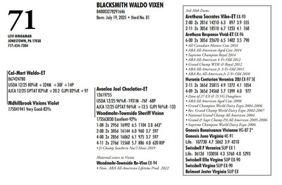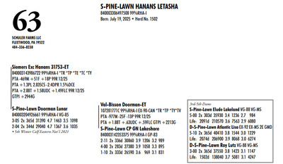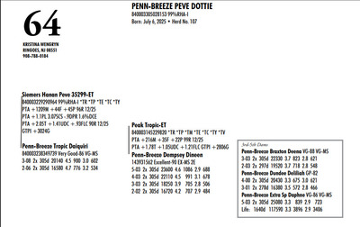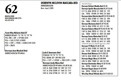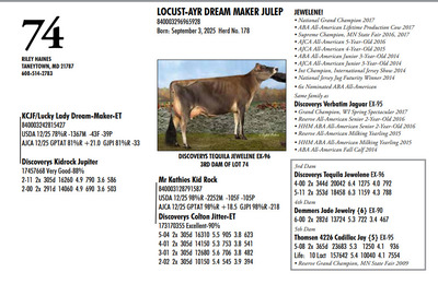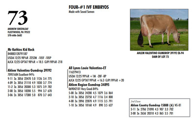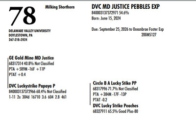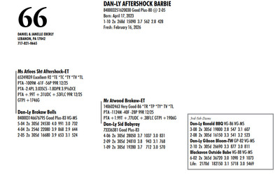 DVC GREEN & GOLD SPRING SPECTACULAR 108 Farm View Road, Doylestown PA, 18901 21st Anniversary Edition Contact Agent: Aaron Ray Tompkins 336-363-4639 Catalog | Terms of Auction Download CATALOG Download SALE ORDER Download UPDATES Download UPDATED LOTS Download UPDATED LOTS Catalog | Terms Download CATALOG Download SALE ORDER Download UPDATES Download UPDATED LOTS Download UPDATED LOTS All Items (95) Cattle (84) Embryos (11) Categories All Items (95) Cattle (84) Embryos (11) Search Item #: Keyword: Search Catalog Item #: Keyword: 20 items per page 50 items per page 100 items per page Go to page #: 1 , 2 , 3 , 4 , 5 #60 – MIDDLEBUSH ALT DARLENE-RED 840003298976978 99%RHA-I *TC *TL 43K GTPI +1989G +2.15T +1.30UDC +1.79FLC A1/A2 BB Location: 108 Farm View Road, Doylestown PA, 18901 Contact Agent: Aaron Ray Tompkins 336-363-4639 More Info / Bid Now Track this Item Sold High Bid: $2,600.00 – #118 #60 – MIDDLEBUSH ALT DARLENE-RED Sold High Bid: $2,600 More Details More Info / Bid Track Item 840003298976978 99%RHA-I *TC *TL 43K GTPI +1989G +2.15T +1.30UDC +1.79FLC A1/A2 BB Location: 108 Farm View Road, Doylestown PA, 18901 Contact Agent: Aaron Ray Tompkins 336-363-4639 #61 – N-S-F THATS NIFTY-RED 840003280829692 99%RHA-I Born: June 26, 2024 Herd No. 692 Due: Late July 2026 to Hereford Bull Location: 108 Farm View Road, Doylestown PA, 18901 Contact Agent: Aaron Ray Tompkins 336-363-4639 More Info / Bid Now Track this Item Sold High Bid: $2,100.00 – #1060 #61 – N-S-F THATS NIFTY-RED Sold High Bid: $2,100 More Details More Info / Bid Track Item 840003280829692 99%RHA-I Born: June 26, 2024 Herd No. 692 Due: Late July 2026 to Hereford Bull Location: 108 Farm View Road, Doylestown PA, 18901 Contact Agent: Aaron Ray Tompkins 336-363-4639 #62 – DERRWYN MCLOVIN MASCARA-RED 840003288543248 Born: June 3, 2025 Location: 108 Farm View Road, Doylestown PA, 18901 Contact Agent: Aaron Ray Tompkins 336-363-4639 More Info / Bid Now Track this Item Sold High Bid: $2,100.00 – #118 #62 – DERRWYN MCLOVIN MASCARA-RED Sold High Bid: $2,100 More Details More Info / Bid Track Item 840003288543248 Born: June 3, 2025 Location: 108 Farm View Road, Doylestown PA, 18901 Contact Agent: Aaron Ray Tompkins 336-363-4639 #63 – S-PINE-LAWN HANANS LETASHA 840003306497508 99%RHA-I Born: July 19, 2025 Herd No. 1502 Location: 108 Farm View Road, Doylestown PA, 18901 Contact Agent: Aaron Ray Tompkins 336-363-4639 More Info / Bid Now Track this Item Sold High Bid: $2,200.00 – #118 #63 – S-PINE-LAWN HANANS LETASHA Sold High Bid: $2,200 More Details More Info / Bid Track Item 840003306497508 99%RHA-I Born: July 19, 2025 Herd No. 1502 Location: 108 Farm View Road, Doylestown PA, 18901 Contact Agent: Aaron Ray Tompkins 336-363-4639 #64 – PENN-BREEZE PEVE DOTTIE 840003305028153 99%RHA-I Born: July 6, 2025 Herd No. 107 Location: 108 Farm View Road, Doylestown PA, 18901 Contact Agent: Aaron Ray Tompkins 336-363-4639 More Info / Bid Now Track this Item Sold High Bid: $2,750.00 – #136 #64 – PENN-BREEZE PEVE DOTTIE Sold High Bid: $2,750 More Details More Info / Bid Track Item 840003305028153 99%RHA-I Born: July 6, 2025 Herd No. 107 Location: 108 Farm View Road, Doylestown PA, 18901 Contact Agent: Aaron Ray Tompkins 336-363-4639 #65 – CHASINDREAMS PBJ ELVIRA Registration Pending Born: December 1, 2025 Location: 108 Farm View Road, Doylestown PA, 18901 Contact Agent: Aaron Ray Tompkins 336-363-4639 More Info / Bid Now Track this Item Sold High Bid: $1,850.00 – #110 #65 – CHASINDREAMS PBJ ELVIRA Sold High Bid: $1,850 More Details More Info / Bid Track Item Registration Pending Born: December 1, 2025 Location: 108 Farm View Road, Doylestown PA, 18901 Contact Agent: Aaron Ray Tompkins 336-363-4639 #66 – DAN-LY AFTERSHOCK BARBIE 840003251620030 Good Plus-80 @ 2-05 Born: April 17, 2023 1-10 2x 268d 15090 3.7 562 2.8 428 Fresh: February 16, 2026 Location: 108 Farm View Road, Doylestown PA, 18901 Contact Agent: Aaron Ray Tompkins 336-363-4639 More Info / Bid Now Track this Item Sold High Bid: $2,850.00 – #104 #66 – DAN-LY AFTERSHOCK BARBIE Sold High Bid: $2,850 More Details More Info / Bid Track Item 840003251620030 Good Plus-80 @ 2-05 Born: April 17, 2023 1-10 2x 268d 15090 3.7 562 2.8 428 Fresh: February 16, 2026 Location: 108 Farm View Road, Doylestown PA, 18901 Contact Agent: Aaron Ray Tompkins 336-363-4639 #67 – HEIFER CALF Registration Pending Born: September 18, 2025 Location: 108 Farm View Road, Doylestown PA, 18901 Contact Agent: Aaron Ray Tompkins 336-363-4639 More Info / Bid Now Track this Item Sold High Bid: $2,600.00 – #1053 #67 – HEIFER CALF Sold High Bid: $2,600 More Details More Info / Bid Track Item Registration Pending Born: September 18, 2025 Location: 108 Farm View Road, Doylestown PA, 18901 Contact Agent: Aaron Ray Tompkins 336-363-4639 #68 – PLEASANT NOOK MANGO DAIQUIRI-ET 840003288247258 Born: March 1, 2024 Herd No. 31 Fresh: March 3, 2026 Location: 108 Farm View Road, Doylestown PA, 18901 Contact Agent: Aaron Ray Tompkins 336-363-4639 More Info / Bid Now Track this Item No Bids Starting at $1,000.00 Login to Bid #68 – PLEASANT NOOK MANGO DAIQUIRI-ET Starting at $1,000.00 Login to Bid More Details More Info / Bid Track Item 840003288247258 Born: March 1, 2024 Herd No. 31 Fresh: March 3, 2026 Location: 108 Farm View Road, Doylestown PA, 18901 Contact Agent: Aaron Ray Tompkins 336-363-4639 #69 – CANADIAN CLUB X RICH EMBRYOS FIVE-#1 IVF EMBRYOS Made with Sexed Semen Located at: Trans Ova, Madison, WI Location: 108 Farm View Road, Doylestown PA, 18901 Contact Agent: Aaron Ray Tompkins 336-363-4639 More Info / Bid Now Track this Item Sold High Bid: $225.00 – #1086 Auction Type: Quantity x Price Quantity: 5 #69 – CANADIAN CLUB X RICH EMBRYOS Quantity x PriceQuantity: 5 Sold High Bid: $225 More Details More Info / Bid Track Item FIVE-#1 IVF EMBRYOS Made with Sexed Semen Located at: Trans Ova, Madison, WI Location: 108 Farm View Road, Doylestown PA, 18901 Contact Agent: Aaron Ray Tomp