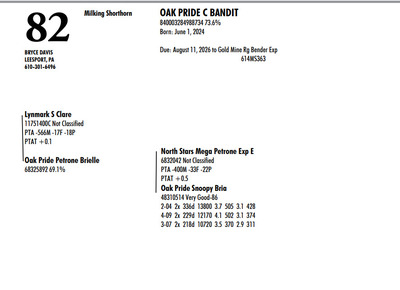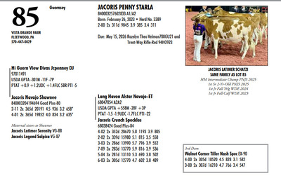 DVC GREEN & GOLD SPRING SPECTACULAR 108 Farm View Road, Doylestown PA, 18901 21st Anniversary Edition Contact Agent: Aaron Ray Tompkins 336-363-4639 Catalog | Terms of Auction Download CATALOG Download SALE ORDER Download UPDATES Download UPDATED LOTS Download UPDATED LOTS Catalog | Terms Download CATALOG Download SALE ORDER Download UPDATES Download UPDATED LOTS Download UPDATED LOTS All Items (95) Cattle (84) Embryos (11) Categories All Items (95) Cattle (84) Embryos (11) Search Item #: Keyword: Search Catalog Item #: Keyword: 20 items per page 50 items per page 100 items per page Go to page #: 1 , 2 , 3 , 4 , 5 #80 – CLEARVIEW JUSTICE AVON EXP ET 840003243659863 57.4% Born: March 26, 2025 Tattoo K27 Location: 108 Farm View Road, Doylestown PA, 18901 Contact Agent: Aaron Ray Tompkins 336-363-4639 More Info / Bid Now Track this Item Sold High Bid: $3,000.00 – #124 #80 – CLEARVIEW JUSTICE AVON EXP ET Sold High Bid: $3,000 More Details More Info / Bid Track Item 840003243659863 57.4% Born: March 26, 2025 Tattoo K27 Location: 108 Farm View Road, Doylestown PA, 18901 Contact Agent: Aaron Ray Tompkins 336-363-4639 #81 – CLEARVIEW BENDER AVERY EXP 840003243689862 53.8% Born: December 13, 2024 Location: 108 Farm View Road, Doylestown PA, 18901 Contact Agent: Aaron Ray Tompkins 336-363-4639 More Info / Bid Now Track this Item Sold High Bid: $1,800.00 – #118 #81 – CLEARVIEW BENDER AVERY EXP Sold High Bid: $1,800 More Details More Info / Bid Track Item 840003243689862 53.8% Born: December 13, 2024 Location: 108 Farm View Road, Doylestown PA, 18901 Contact Agent: Aaron Ray Tompkins 336-363-4639 #82 – OAK PRIDE C BANDIT 840003284988734 73.6% Born: June 1, 2024 Due: August 11, 2026 to Gold Mine Rg Bender Exp 614MS363 Location: 108 Farm View Road, Doylestown PA, 18901 Contact Agent: Aaron Ray Tompkins 336-363-4639 More Info / Bid Now Track this Item Sold High Bid: $2,000.00 – #124 #82 – OAK PRIDE C BANDIT Sold High Bid: $2,000 More Details More Info / Bid Track Item 840003284988734 73.6% Born: June 1, 2024 Due: August 11, 2026 to Gold Mine Rg Bender Exp 614MS363 Location: 108 Farm View Road, Doylestown PA, 18901 Contact Agent: Aaron Ray Tompkins 336-363-4639 #83 – HARD CORE SPIDERMAN DERBY 68333426 Born: June 14, 2025 Location: 108 Farm View Road, Doylestown PA, 18901 Contact Agent: Aaron Ray Tompkins 336-363-4639 More Info / Bid Now Track this Item Sold High Bid: $1,500.00 – #1060 #83 – HARD CORE SPIDERMAN DERBY Sold High Bid: $1,500 More Details More Info / Bid Track Item 68333426 Born: June 14, 2025 Location: 108 Farm View Road, Doylestown PA, 18901 Contact Agent: Aaron Ray Tompkins 336-363-4639 #84 – QUIETNESS INSPIRED FROSTY 840003305913955 Born: December 1, 2025 Herd No. 952 Location: 108 Farm View Road, Doylestown PA, 18901 Contact Agent: Aaron Ray Tompkins 336-363-4639 More Info / Bid Now Track this Item Sold High Bid: $1,200.00 – #102 #84 – QUIETNESS INSPIRED FROSTY Sold High Bid: $1,200 More Details More Info / Bid Track Item 840003305913955 Born: December 1, 2025 Herd No. 952 Location: 108 Farm View Road, Doylestown PA, 18901 Contact Agent: Aaron Ray Tompkins 336-363-4639 #85 – JACORIS PENNY STARLA 840003257602833 A1/A2 Born: February 26, 2023 Herd No. 3389 2-00 2x 311d 9845 3.9 385 3.4 311 Due: May 15, 2026 Rozelyn Theo Velman788GU21 and Trent-Way Rifle Location: 108 Farm View Road, Doylestown PA, 18901 Contact Agent: Aaron Ray Tompkins 336-363-4639 More Info / Bid Now Track this Item Sold High Bid: $2,800.00 – #1056 #85 – JACORIS PENNY STARLA Sold High Bid: $2,800 More Details More Info / Bid Track Item 840003257602833 A1/A2 Born: February 26, 2023 Herd No. 3389 2-00 2x 311d 9845 3.9 385 3.4 311 Due: May 15, 2026 Rozelyn Theo Velman788GU21 and Trent-Way Rifle Location: 108 Farm View Road, Doylestown PA, 18901 Contact Agent: Aaron Ray Tompkins 336-363-4639 #86 – MCAVOY LANE FREEDOM PATRIOT 97018845 A2A2 Born: May 30, 2024 Buy him, Pay, Then Pick up at Seller’s Farm by April 14, 2026 Location: 108 Farm View Road, Doylestown PA, 18901 Contact Agent: Aaron Ray Tompkins 336-363-4639 More Info / Bid Now Track this Item No Bids Starting at $1,000.00 Login to Bid #86 – MCAVOY LANE FREEDOM PATRIOT Starting at $1,000.00 Login to Bid More Details More Info / Bid Track Item 97018845 A2A2 Born: May 30, 2024 Buy him, Pay, Then Pick up at Seller’s Farm by April 14, 2026 Location: 108 Farm View Road, Doylestown PA, 18901 Contact Agent: Aaron Ray Tompkins 336-363-4639 #87 – TERRA-ROSE THUNDER FLICKA 840003256125866 99%RHA-I VG-86 Born: June 28, 2022 Herd No. 29 2-05 2x 332d 22230 3.6 799 3.1 682 Fresh: March 2, 2026 Location: 108 Farm View Road, Doylestown PA, 18901 Contact Agent: Aaron Ray Tompkins 336-363-4639 More Info / Bid Now Track this Item Sold High Bid: $5,600.00 – #131 #87 – TERRA-ROSE THUNDER FLICKA Sold High Bid: $5,600 More Details More Info / Bid Track Item 840003256125866 99%RHA-I VG-86 Born: June 28, 2022 Herd No. 29 2-05 2x 332d 22230 3.6 799 3.1 682 Fresh: March 2, 2026 Location: 108 Farm View Road, Doylestown PA, 18901 Contact Agent: Aaron Ray Tompkins 336-363-4639 #88 – REDCARPET DVORE CHECKERS-ET 840003300557201 99%RHA-I *RC Born: December 17, 2025 Herd No. 794 Location: 108 Farm View Road, Doylestown PA, 18901 Contact Agent: Aaron Ray Tompkins 336-363-4639 More Info / Bid Now Track this Item Sold High Bid: $2,500.00 – #112 #88 – REDCARPET DVORE CHECKERS-ET Sold High Bid: $2,500 More Details More Info / Bid Track Item 840003300557201 99%RHA-I *RC Born: December 17, 2025 Herd No. 794 Location: 108 Farm View Road, Doylestown PA, 18901 Contact Agent: Aaron Ray Tompkins 336-363-4639 #89 – OAKFIELD HULU FALCON-ET 840003300557182 99%RHA-I *RC Born: September 1, 2025 Herd 775 Location: 108 Farm View Road, Doylestown PA, 18901 Contact Agent: Aaron Ray Tompkins 336-363-4639 More Info / Bid Now Track this Item Sold High Bid: $4,550.00 – #159 #89 – OAKFIELD HULU FALCON-ET Sold High Bid: $4,550 More Details More Info / Bid Track Item 