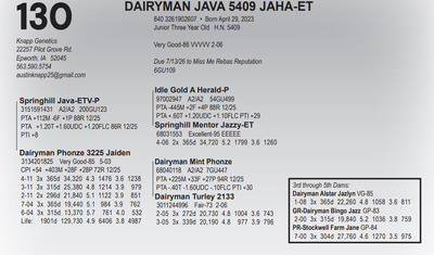 Buyer is purchasing rights to control the next IVF session(s). Buyer is guaranteed IVF sessions until a minimum of 8 #1 or #2 IVF embryos are produced. Embryo grades are determined at the time of transfer if fresh embryos or at time of freezing if freezing is requested by buyer. Buyer keeps all resulting embryos from these controlled IVF sessions. Buyer is responsible for all costs of the aspiration and mating sire decisions.