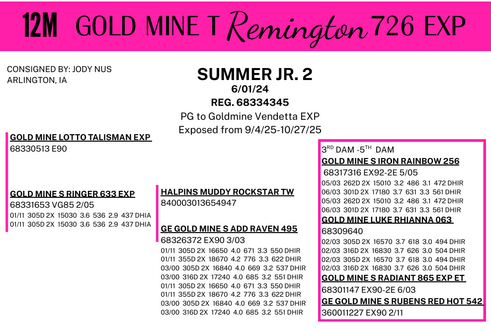 Summer Jr. 6/01/24 Reg#68334345 Preg to Goldmine Vendetta EXP Exposed from 9/4/25-10/27/25 Consigned By Jody Nus