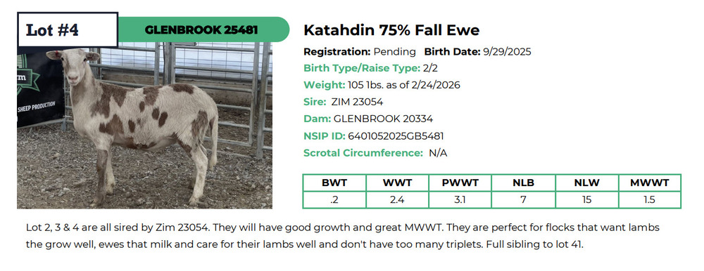 DESCIPTION: Lot 2, 3 & 4 are all sired by Zim 23054. They will have good growth and great MWWT. They are perfect for flocks that want lambs the grow well, ewes that milk and care for their lambs well and don't have too many triplets. Full sibling to lot 41. DOB: 09/29/25