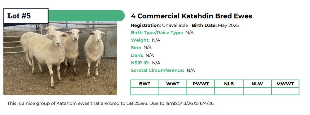 DESCIPTION: This is a nice group of Katahdin ewes that are bred to GB 25395. Due to lamb 5/13/26 to 6/4/26. DOB: 05/01/25