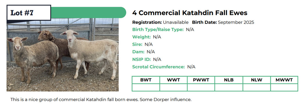 DESCIPTION: This is a nice group of commercial Katahdin fall born ewes. Some Dorper influence. DOB: 09/01/25