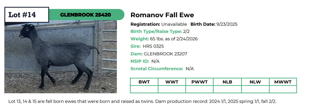 DESCIPTION: Lot 13, 14 & 15 are fall born ewes that were born and raised as twins. Dam production record: 2024 1/1, 2025 spring 1/1, fall 2/2.