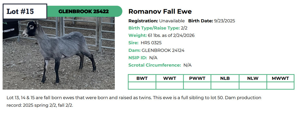 DESCIPTION: Lot 13, 14 & 15 are fall born ewes that were born and raised as twins. This ewe is a full sibling to lot 50. Dam production record: 2025 spring 2/2, fall 2/2.